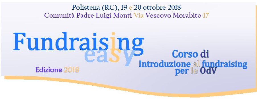 Sono aperte le iscrizioni per il Corso di formazione “Fundraising is easy” che si svolgerà il 19 e 20 ottobre 2018 a Polistena presso la Comunità Padre Luigi Monti, sita in Via Vescovo Morabito n. 17.