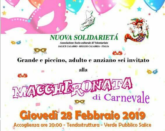 Giovedì 28 Febbraio 2019 alle ore 20.00 presso la Tendostruttura del Verde Pubblico di Salice, l’Associazione Nuova Solidarietà invita tutti alla Maccheronata di Carnevale. Per motivi organizzativi è richiesta la prenotazione entro le ore 20.00 di mercoledì 27 febbraio telefonando allo 0965-302121.