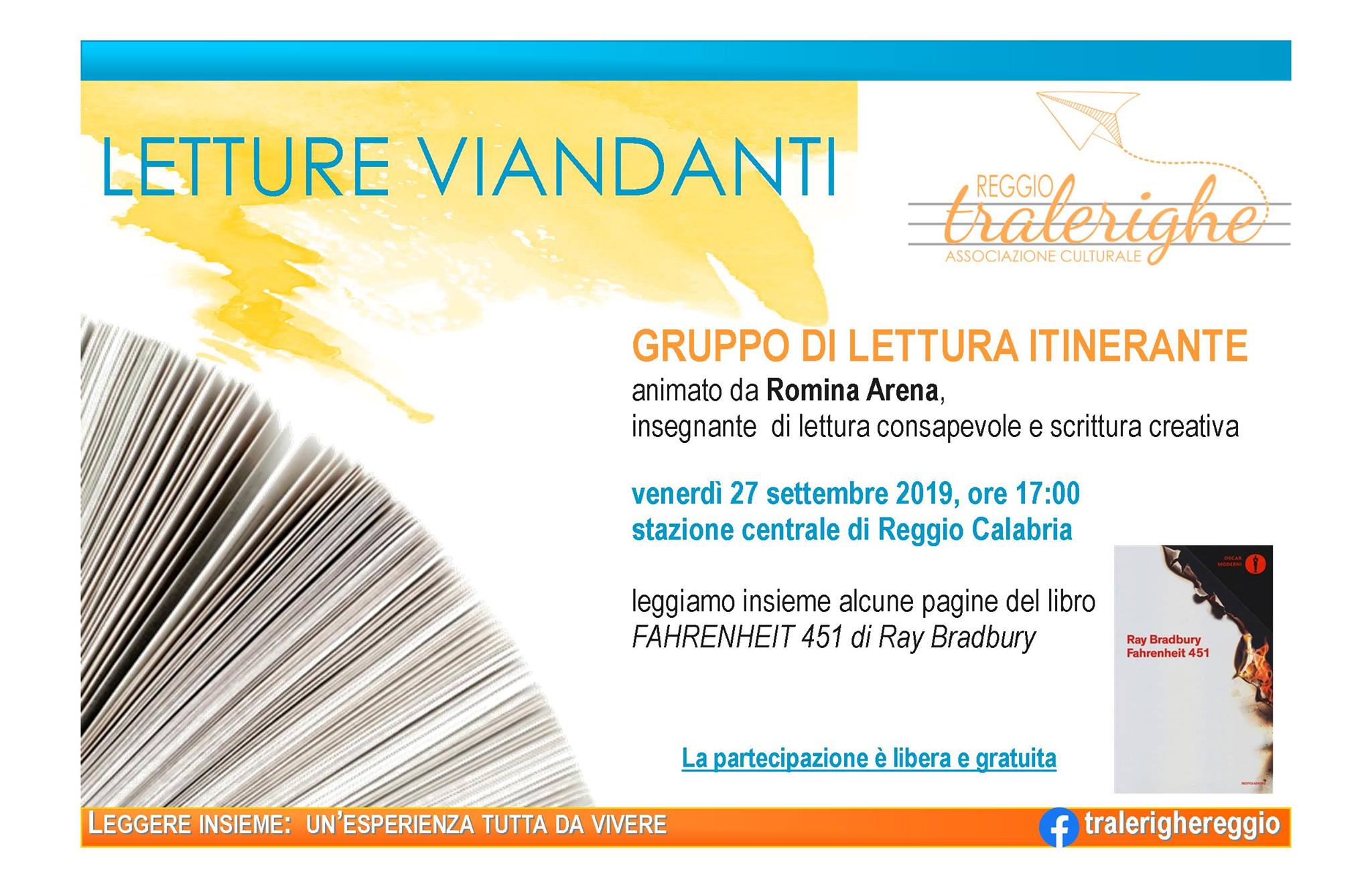 Il primo laboratorio sarà animato da Romina Arena, insegnante di lettura consapevole e di scrittura creativa, e si si terrà venerdì 27 settembre alle 17:00 nella stazione centrale di Reggio: qui i “lettori viandanti” si ritroveranno per leggere insieme alcune pagine del libro Fahrenheit 451 di Ray Bradbury.