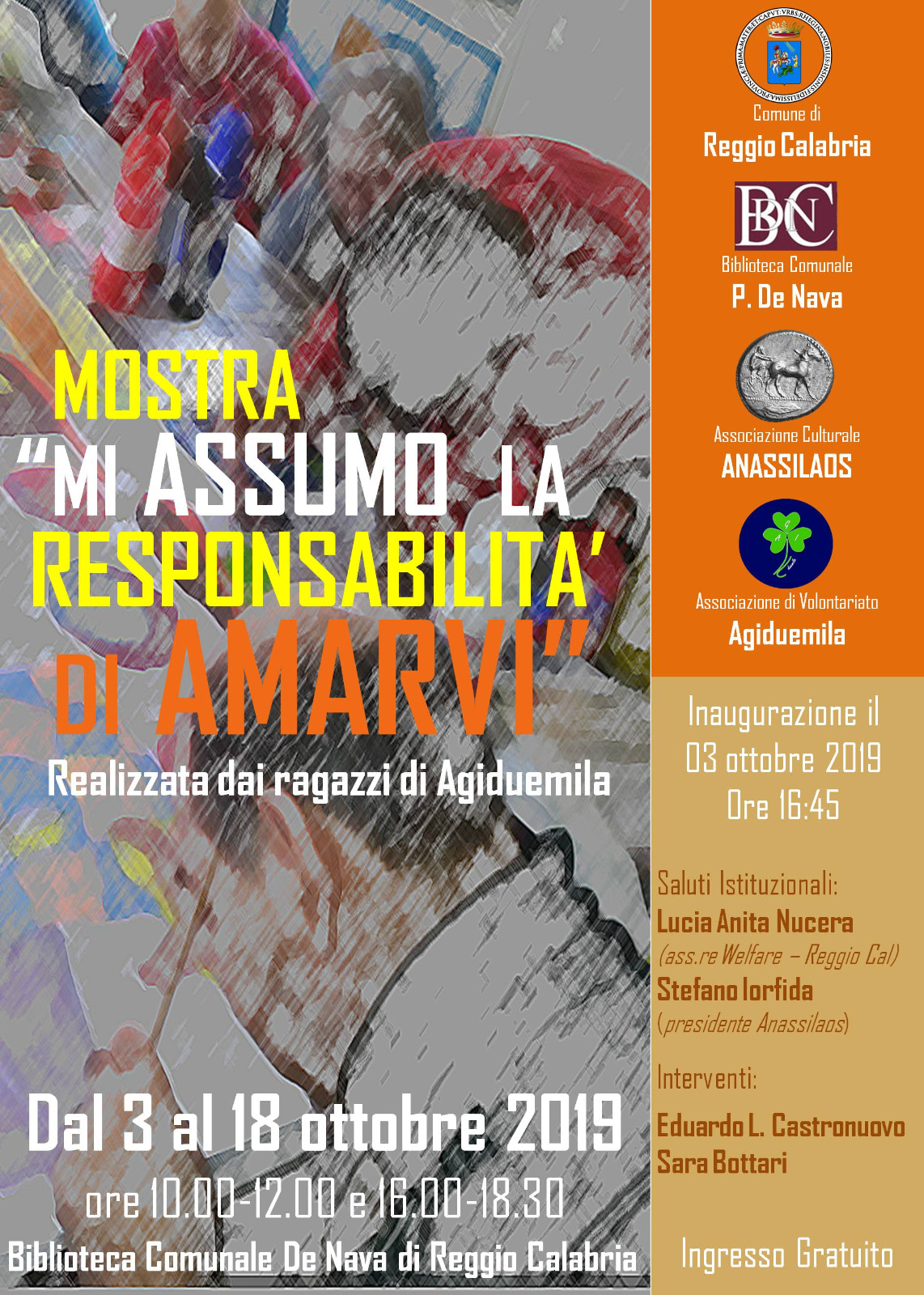 Giovedì 3 ottobre 2019 alle ore 16.45 sarà inaugurata presso la Biblioteca Comunale De Nava di Reggio Calabria la mostra dal titolo “Mi assumo la responsabilità di amarvi”, realizzata dai ragazzi dell’Associazione Agiduemila. La mostra potrà essere visitata dal 3 al 18 ottobre 2019 nei seguenti orari: 10.00 – 12.00 e 16.00 – 18.30.