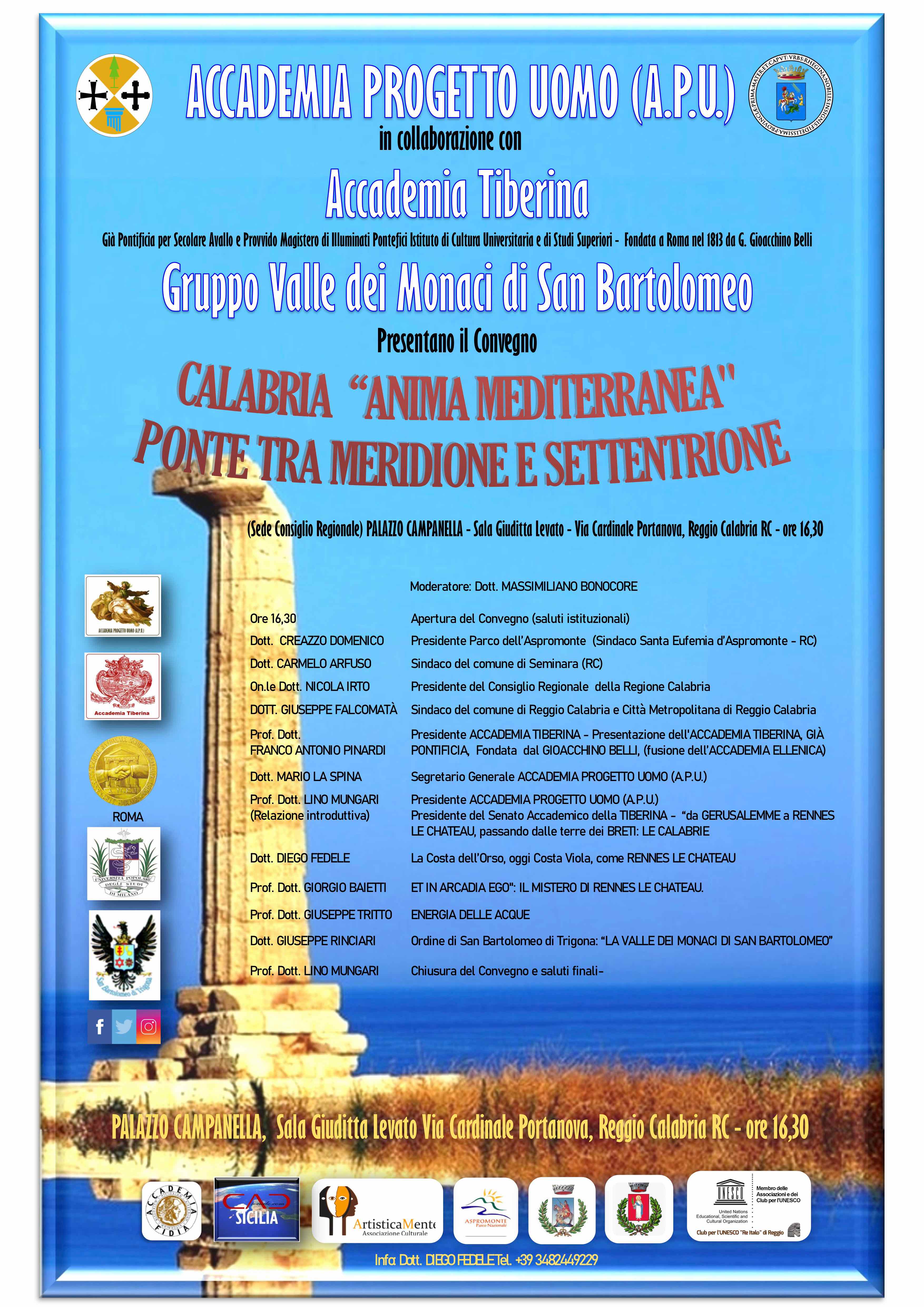Sabato 21 settembre 2019 alle ore 16.30, presso la Sala “Giuditta Levato” del Consiglio Regionale, si terrà il convegno Calabria “Anima mediterranea” Ponte tra meridione e settentrione, promosso dall’Accademia Progetto Uomo.