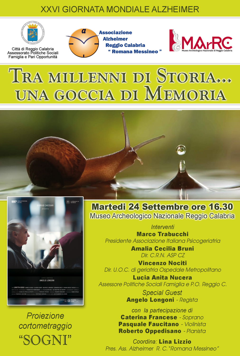 In occasione della XXVI Giornata Mondiale dell’Alzheimer, l’Assessorato Politiche Sociali del Comune di Reggio Calabria, l’associazione Alzheimer Reggio Calabria “Romana Messineo” e il MArRC promuovono il convegno dal titolo “Tra millenni di storia … una goccia di memoria”. L’evento si terrà martedì 24 settembre 2019 alle ore alle ore 16.30, presso il Museo Archeologico Nazionale di Reggio Calabria. Durante il convegno verrà proiettato il cortometraggio “Sogni”.