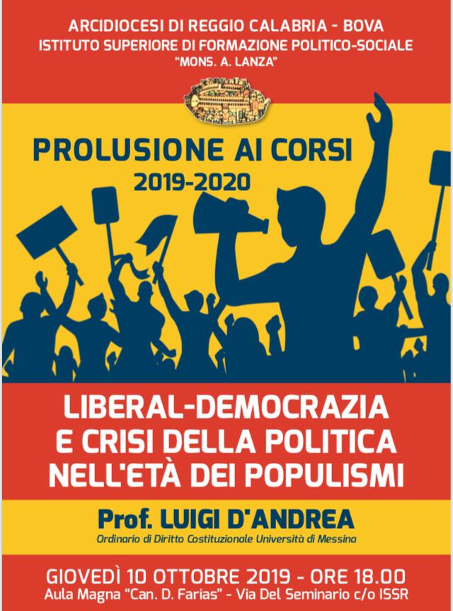 Dopo una breve introduzione e presentazione del programma annuale da parte del Prof. Antonino Spadaro, Direttore dell’Istituto, sarà il Prof. Luigi D’Andrea, Ordinario di Diritto costituzionale nell’Università degli Studi di Messina,  ad inaugurare i corsi e a relazionare su “LIBERAL – DEMOCRAZIA E CRISI DELLA POLITICA NELL’ETA’ DEI POPULISMI”.