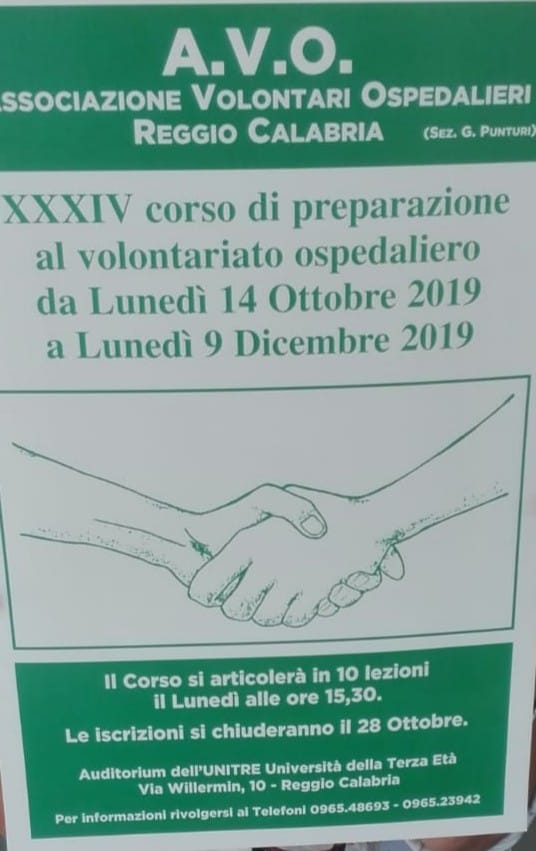 Il 14 ottobre inizia il Corso di formazione per nuovi volontari AVO. Le iscrizioni si effettuano nella sede del corso il primo giorno di lezione. Il programma sarà reso noto in occasione dell’avvio del Corso stesso.