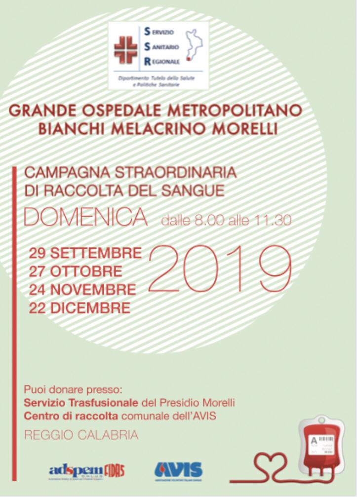 Torna la campagna straordinaria di raccolta sangue del Grande Ospedale Metropolitano di Reggio Calabria. Domenica 24 novembre dalle ore 8.00 alle ore 11.30 sarà possibile donare presso il Servizio Trasfusionale del Presidio Morelli e presso il Centro di raccolta comunale dell’Avis.