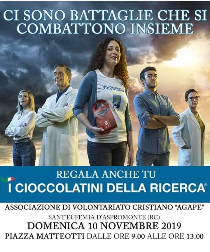 Anche quest’anno i volontari dell’Agape saranno al fianco dell’Airc per sostenere la ricerca nella lotta contro il cancro. L’appuntamento è in piazza Matteotti, domenica 10 novembre dalle ore 9.00 alle 13.00, per la distribuzione dei cioccolatini della ricerca, che sarà possibile acquistare con una donazione di 10 euro. Per la prevendita contattare i volontari dell’associazione.