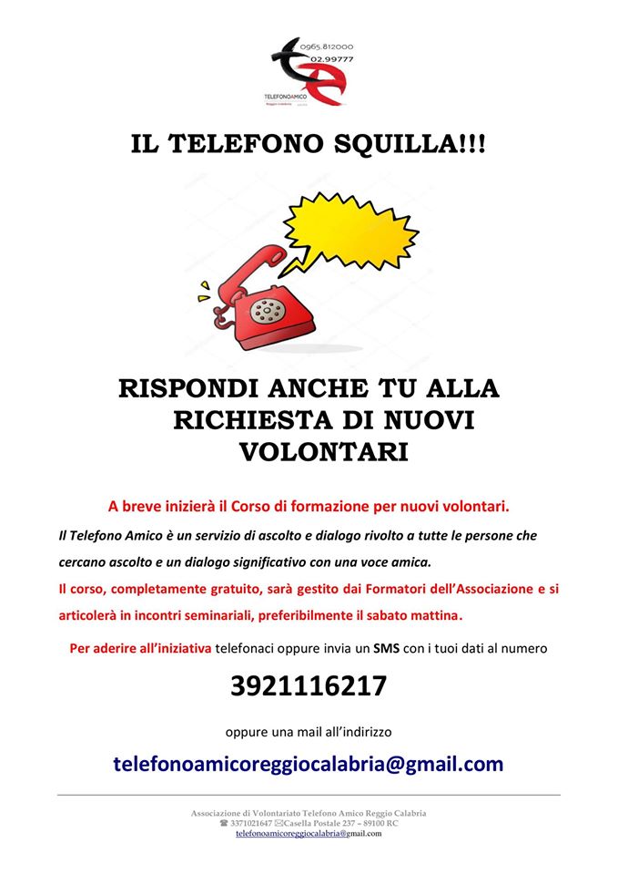 Il Telefono Amico di Reggio Calabria comunica che a breve avrà inizio il corso di formazione per nuovi volontari.