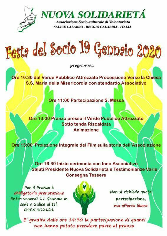 L’associazione Nuova Solidarietà organizza la Festa del Socio nella giornata di domenica 19 gennaio 2020 a partire dalle ore 10.30.