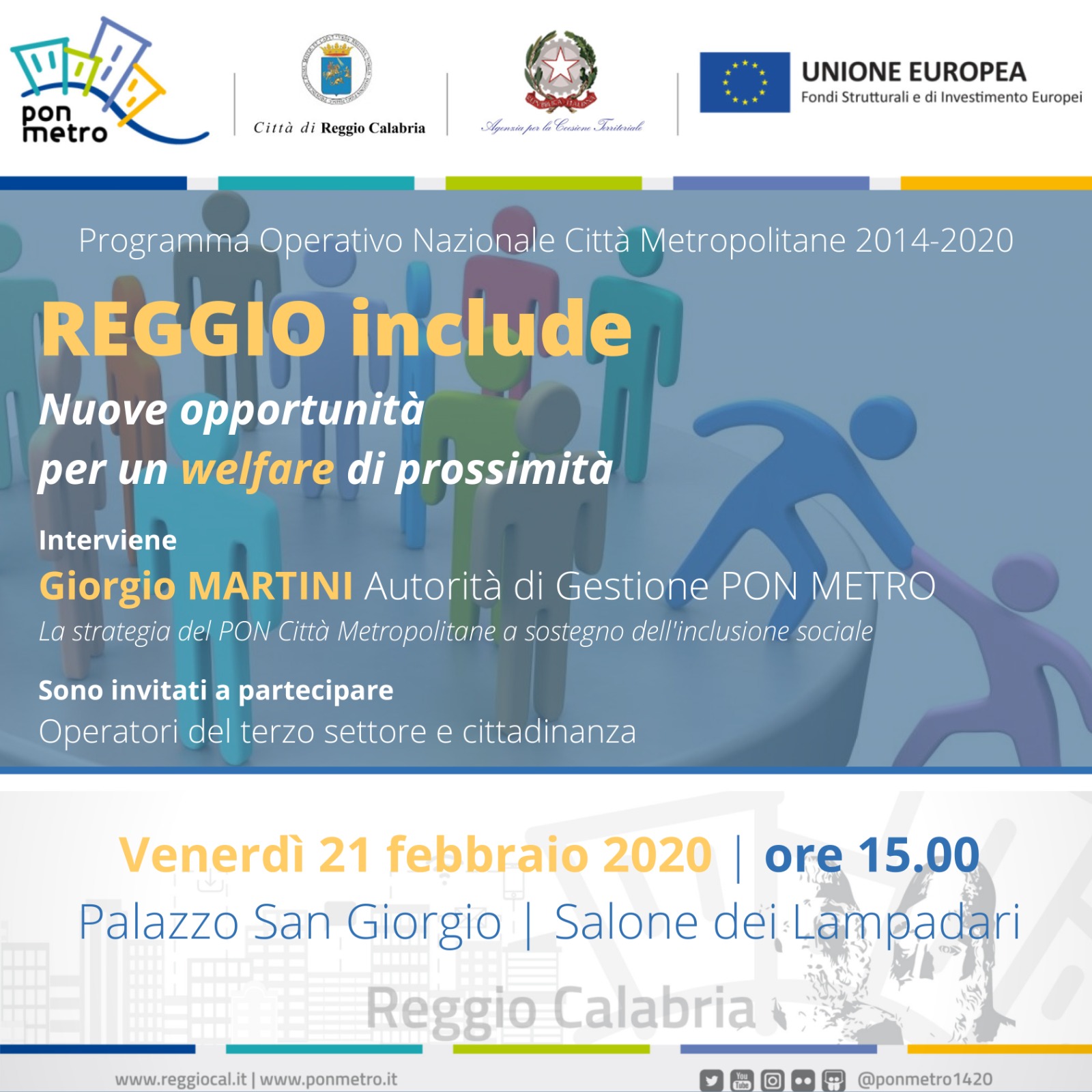 Venerdì 21 febbraio alle ore 15.00 presso il Salone dei Lampadari di Palazzo San Giorgio è in programma il convegno dal titolo “Reggio Include: le nuove opportunità del Pon Città Metropolitane per un welfare di prossimità”.