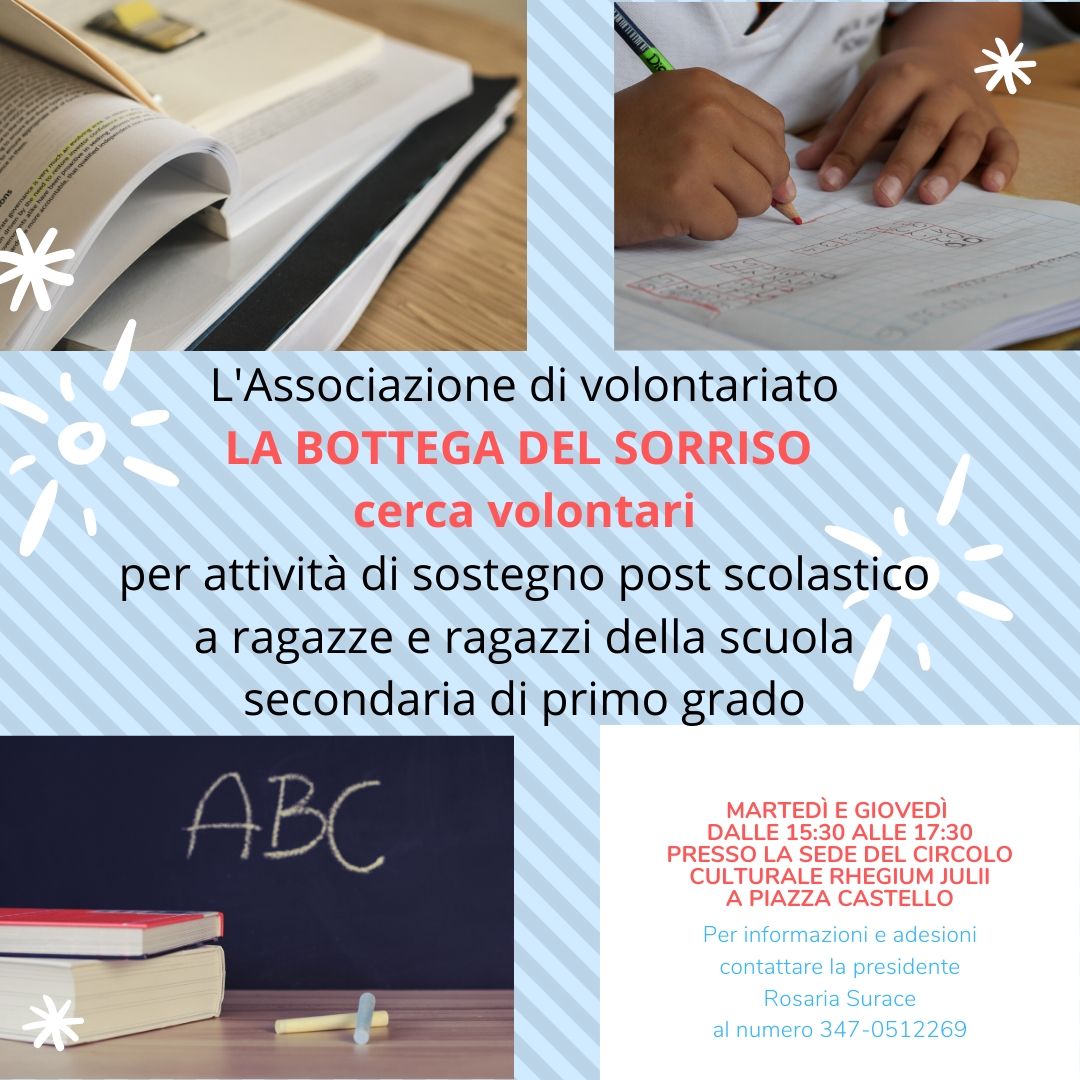 L’associazione di volontariato “La Bottega del Sorriso” cerca volontari per attività di accoglienza e sostegno post scolastico a ragazze e ragazzi della scuola secondaria di primo grado.