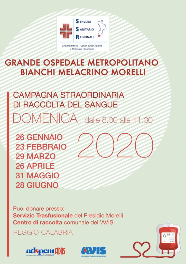 Ultimo giorno della campagna straordinaria di raccolta sangue del Grande Ospedale Metropolitano di Reggio Calabria prima della chiusura per il periodo estivo. Domenica 28 giugno dalle ore 8.00 alle ore 11.30 sarà possibile donare presso il Servizio Trasfusionale del Presidio Morelli e presso il Centro di raccolta comunale dell’Avis.
