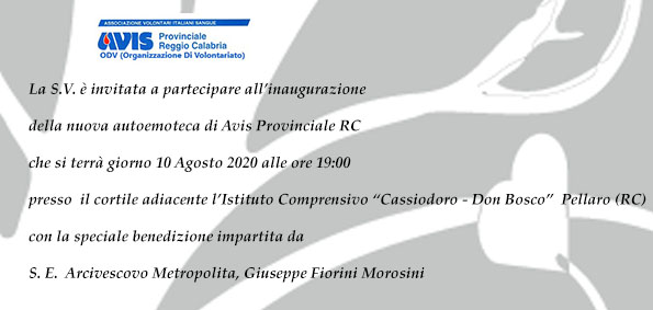 Lunedì 10 agosto 2020, presso il cortile adiacente l’Istituto Comprensivo “Cassiodoro – Don Bosco” di Pellaro, l’AVIS Provinciale di Reggio Calabria inaugurerà la nuova autoemoteca.