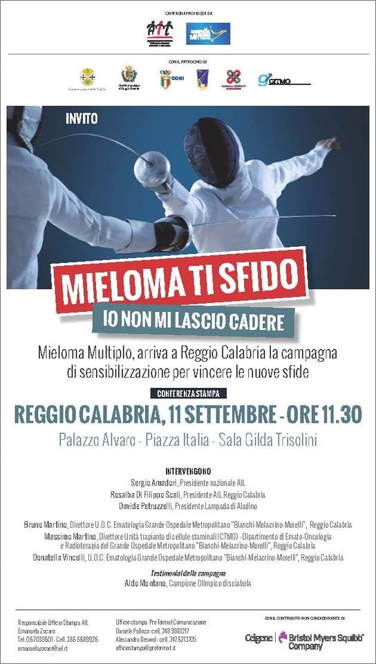 Venerdì 11 settembre 2020 alle ore 11.00 presso Palazzo Alvaro, Sala Gilda Trisolini, a Reggio Calabria, si terrà la presentazione della tappa di Reggio Calabria della campagna di sensibilizzazione “Mieloma ti sfido. Io non mi lascio cadere”. All’evento sarà presente anche il testimonial Aldo Montano, Campione Olimpico di sciabola.