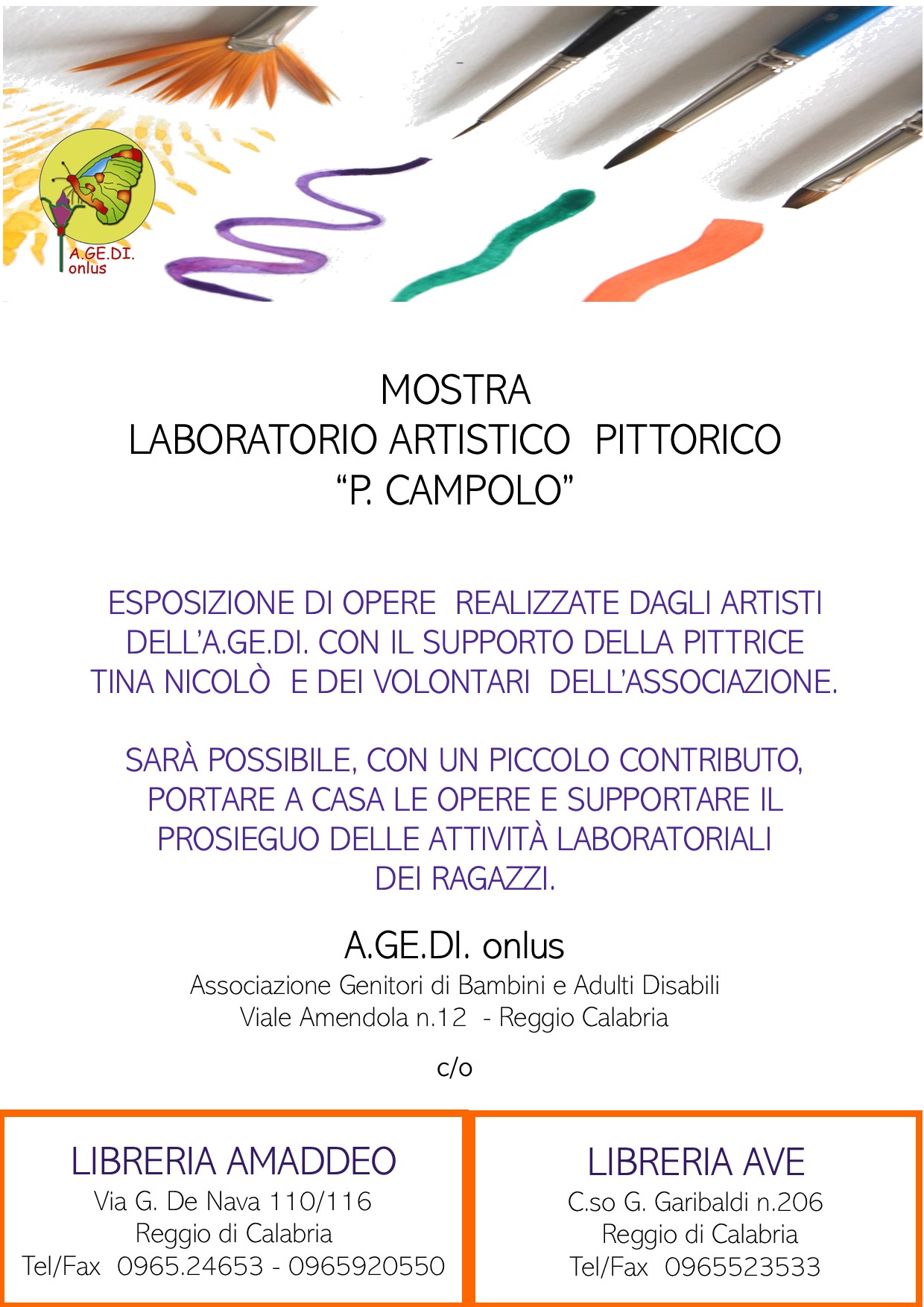 Quest’anno, a causa del periodo che stiamo vivendo, l’Associazione Genitori di Bambini e Adulti Disabili, AGEDI onlus, non ha potuto dedicare, come di consueto, una giornata del mese di Dicembre, per mettere in mostra i lavori effettuati dai loro ragazzi “speciali”, durante il Laboratorio artistico- pittorico che frequentano presso l’Associazione, sotto la guida della pittrice Tina Nicolò. Pertanto, le opere dei ragazzi saranno esposte presso due punti strategici della città: la LIBRERIA AMADDEO e la LIBRERIA AVE. Sarà possibile portare a casa i lavori versando un piccolo contributo che consentirà di supportare il prosieguo del Laboratorio.