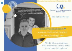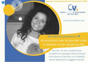 Pubblichiamo altre tre cartoline con i volti e le parole di chi ogni giorno si impegna in attività di volontariato nel nostro territorio metropolitano e di chi, con resilienza e creatività, continua a praticare e inventare modi per alimentare la vicinanza emotiva e la prossimità relazionale nelle nostre comunità, anche in questo tempo pieno di limitazioni, di dolore e di distanza fisica.