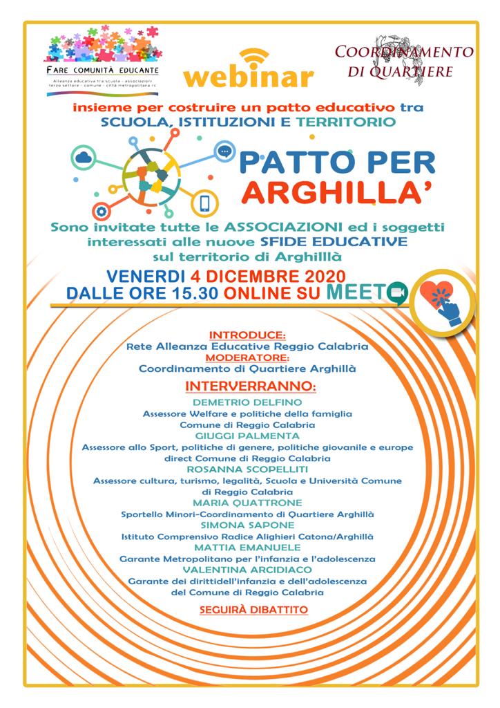 Venerdì 4 dicembre 2020 a partire dalle ore 15.30 sulla piattaforma Meet si terrà il webinar “Insieme per costruire un patto educativo tra scuola, istituzioni e territorio – Patto per Arghillà”.