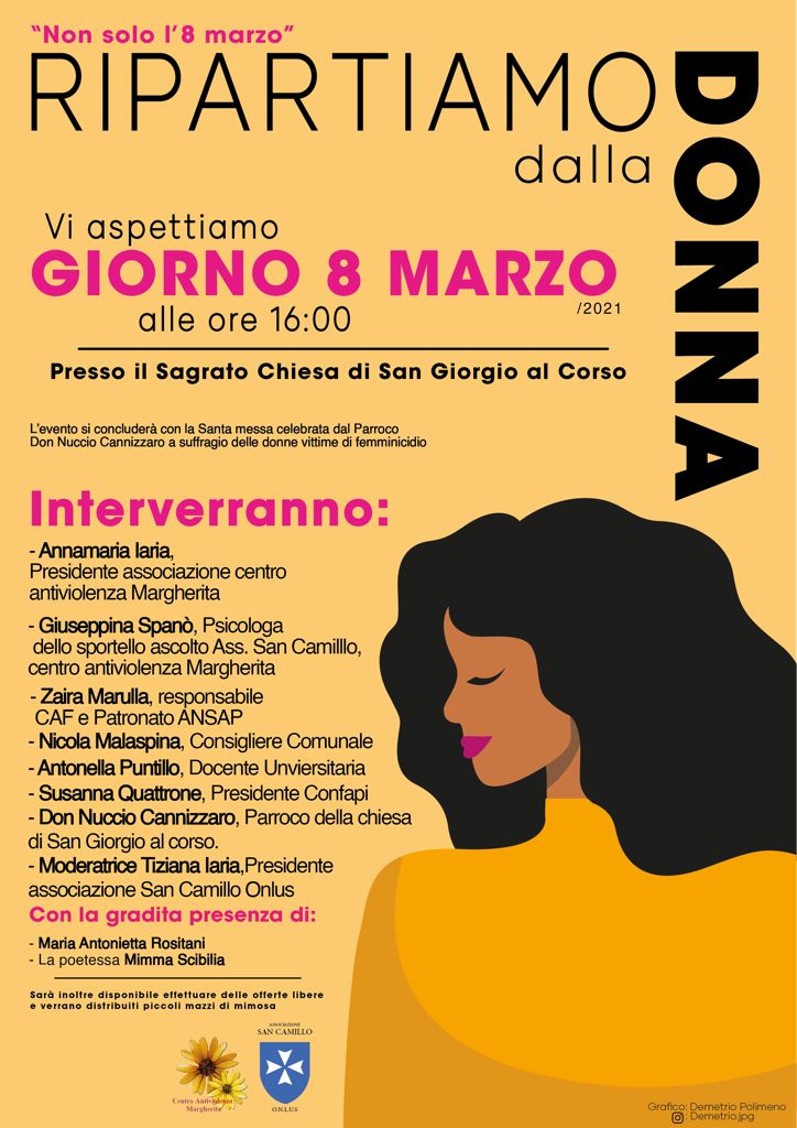 Lunedì 8 marzo 2021 alle ore 16.00, presso il Sagrato della Chiesa di San Giorgio al Corso, si terrà l’evento “Ripartiamo dalla donna” organizzato dal Centro Antiviolenza Margherita e dall’Associazione San Camillo. L’evento si concluderà con la Santa Messa celebrata dal Parroco Don Nuccio Cannizzaro a suffragio delle donne vittime di femminicidio.