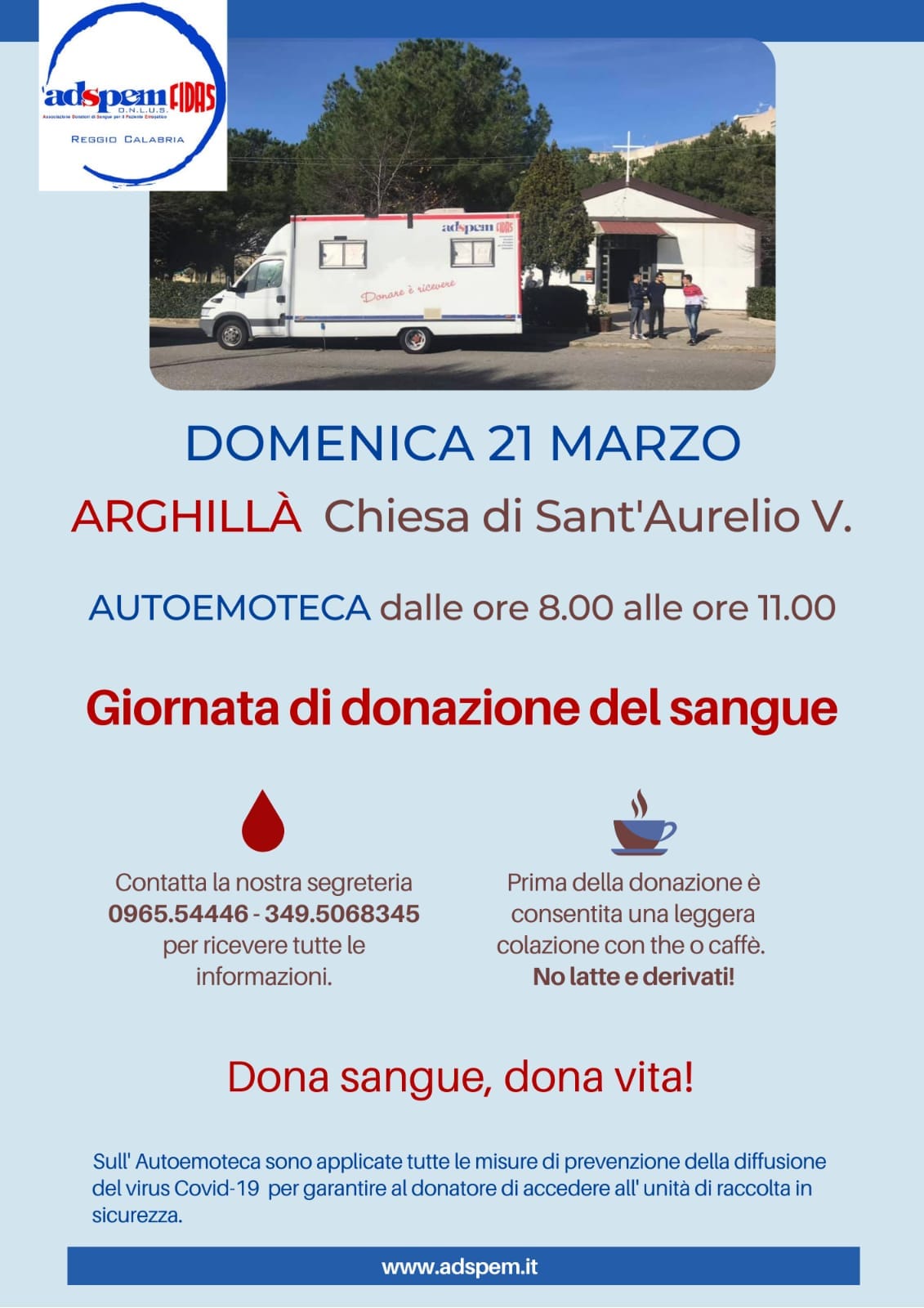 Domenica 21 marzo dalle 8.00 alle 11.00 l’ADSPEM di Reggio Calabria sarà presente con la propria autoemoteca ad Arghillà davanti la Parrocchia di Sant’Aurelio Vescovo.
