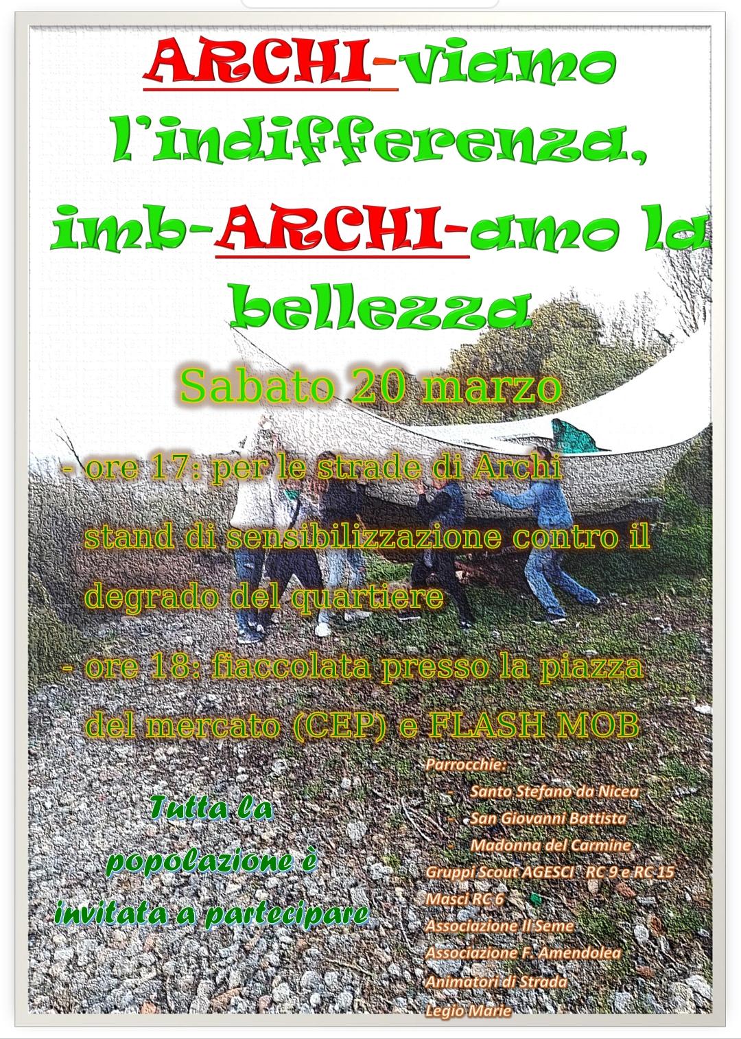 Sabato 20 marzo a partire dalla ore 17.00 si svolgerà nel quartiere di Archi (RC) un evento dal titolo “ARCHI-viamo l’indifferenza, imb-ARCHI-amo la bellezza”, che vedrà coinvolte le Parrocchie e molte realtà associative.