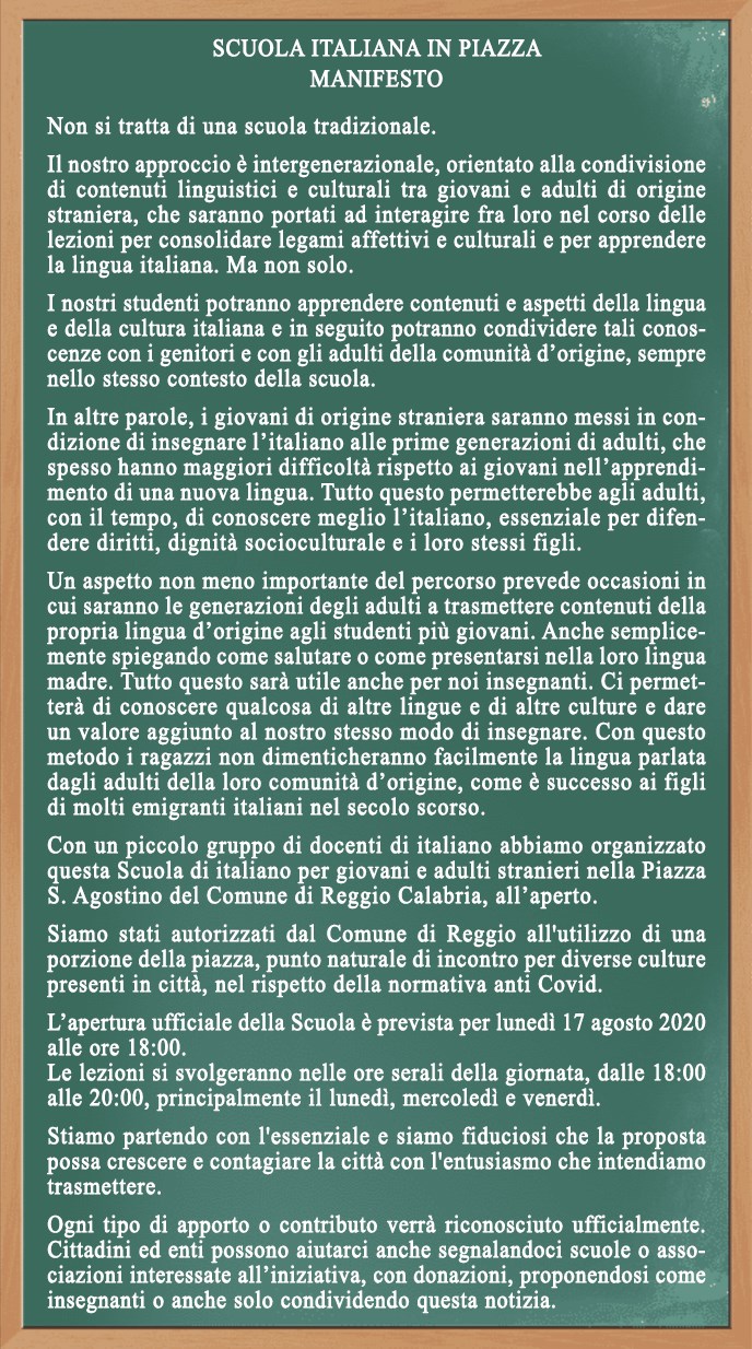 Con l’arrivo della bella stagione però la Scuola tornerà nella sua sede originaria che è Piazza Sant’Agostino, un luogo che – con l’autorizzazione del Comune di Reggio e nel rispetto di tutte le norme anti-covid – è stato e continuerà ad essere punto di incontro storico per diverse culture.