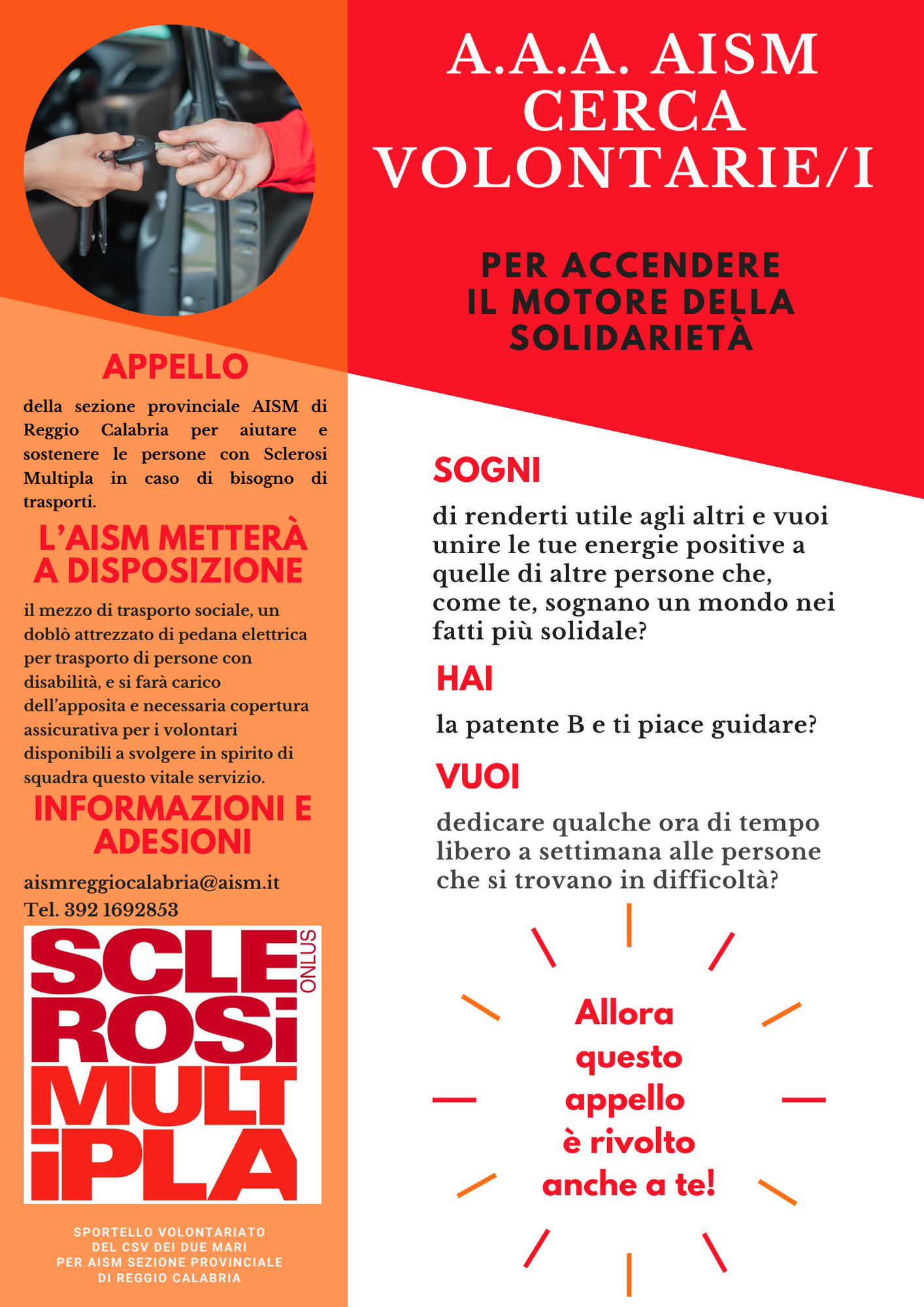 La sezione provinciale reggina di AISM, infatti, cerca volontarie e volontari da coinvolgere nel servizio di trasporto gratuito da offrire alle persone con sclerosi multipla, persone che non dispongono di questa possibilità e che non potrebbero altrimenti raggiungere i luoghi di cura nel territorio comunale e provinciale, con gravissimo danno per la loro vita.