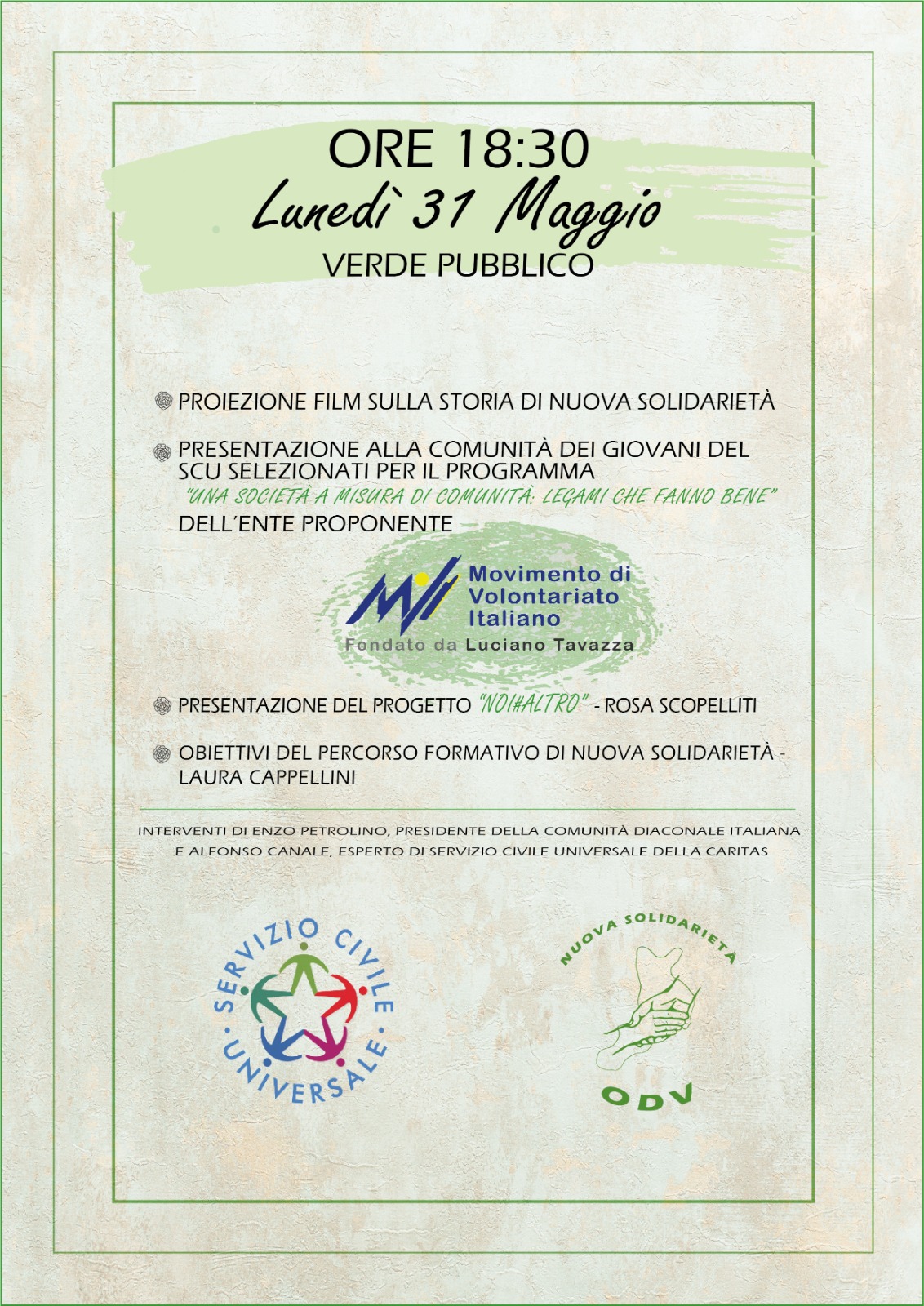 Lunedì 31 maggio alle ore 18.30 presso il Verde Pubblico di Salice a Reggio Calabria, l’associazione Nuova Solidarietà presenterà i giovani del SCU selezionati per il programma “Una società a misura di comunità: legami che fanno bene”.