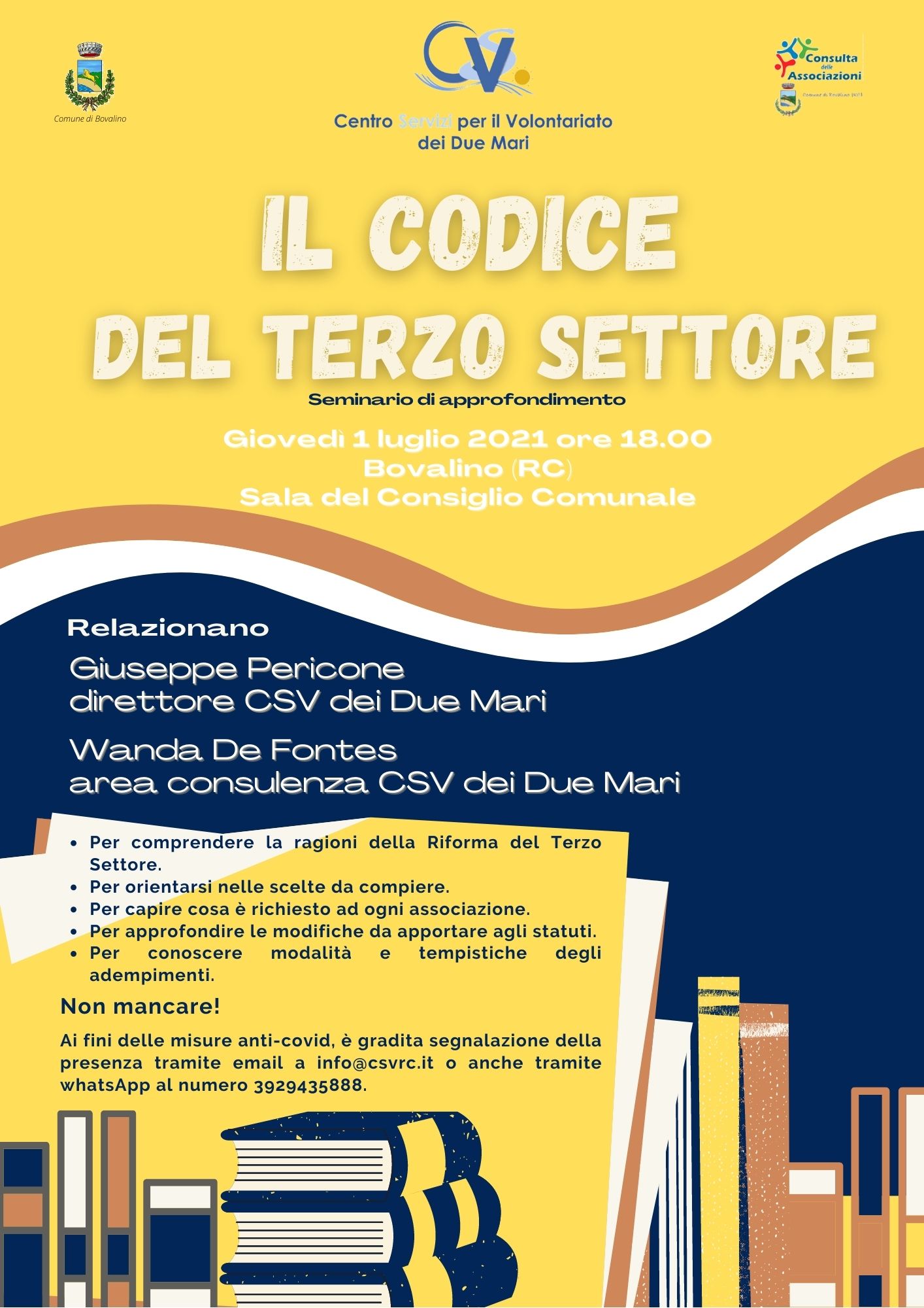 Il CSV dei Due Mari ha organizzato per giovedì 1 luglio 2021, con inizio alle ore 18.00, il seminario di approfondimento “Il codice del Terzo settore”, che si svolgerà a Bovalino presso la Sala del Consiglio Comunale.