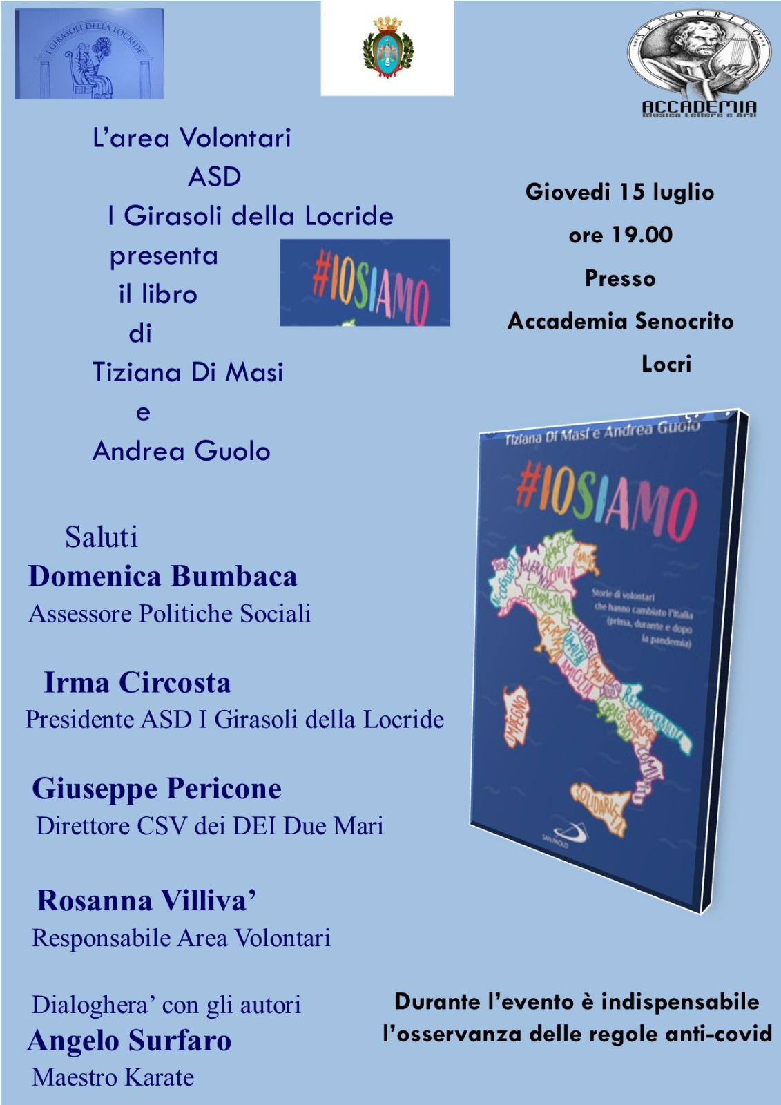 L’area volontari ASD I Girasoli della Locride presenta il libro di Tiziana Di Masi e Andrea Guolo “#Iosiamo”. L’evento si svolgerà giovedì 15 luglio alle ore 19.00 presso l’Accademia Senocrito di Locri. Sarà presente il direttore del CSV dei Due Mari Giuseppe Pericone.