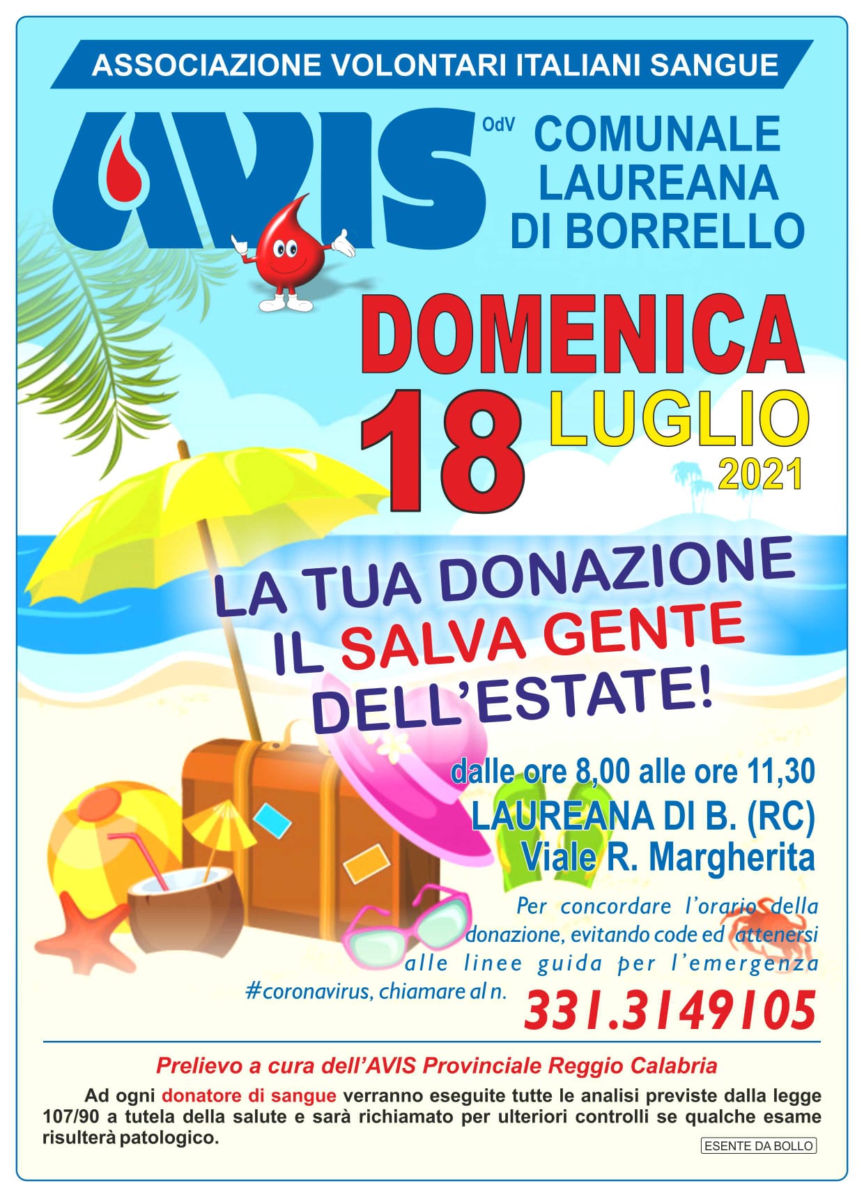 L’AVIS sez. comunale di Laureana di Borrello comunica che domenica 18 luglio dalle ore 8.00 alle ore 11.30 in Viale R. Margherita è stata organizzata una raccolta di sangue.