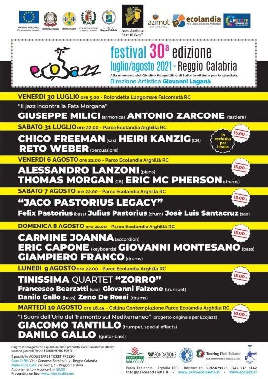 Ritorna l’annuale appuntamento con l’Ecojazz Festival, giunto quest’anno alla sua 30^ edizione. Una serie di eventi musicali che si svolgeranno dal 30 luglio al 10 agosto al Parco Ecolandia ad Arghillà (RC). L’Ecojazz Festival è organizzato dall’associazione “Art Blakey” alla memoria del Giudice Scopelliti e di tutte le vittime per la giustizia.