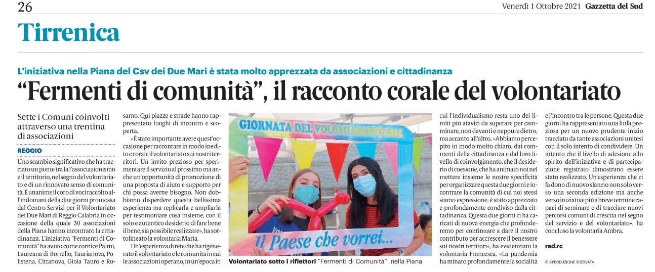 Sabato 25 e domenica 26 settembre 2021 si è svolta la prima edizione di “Fermenti di Comunità”: due Giornate del Volontariato della Piana promosse dal nostro CSV.