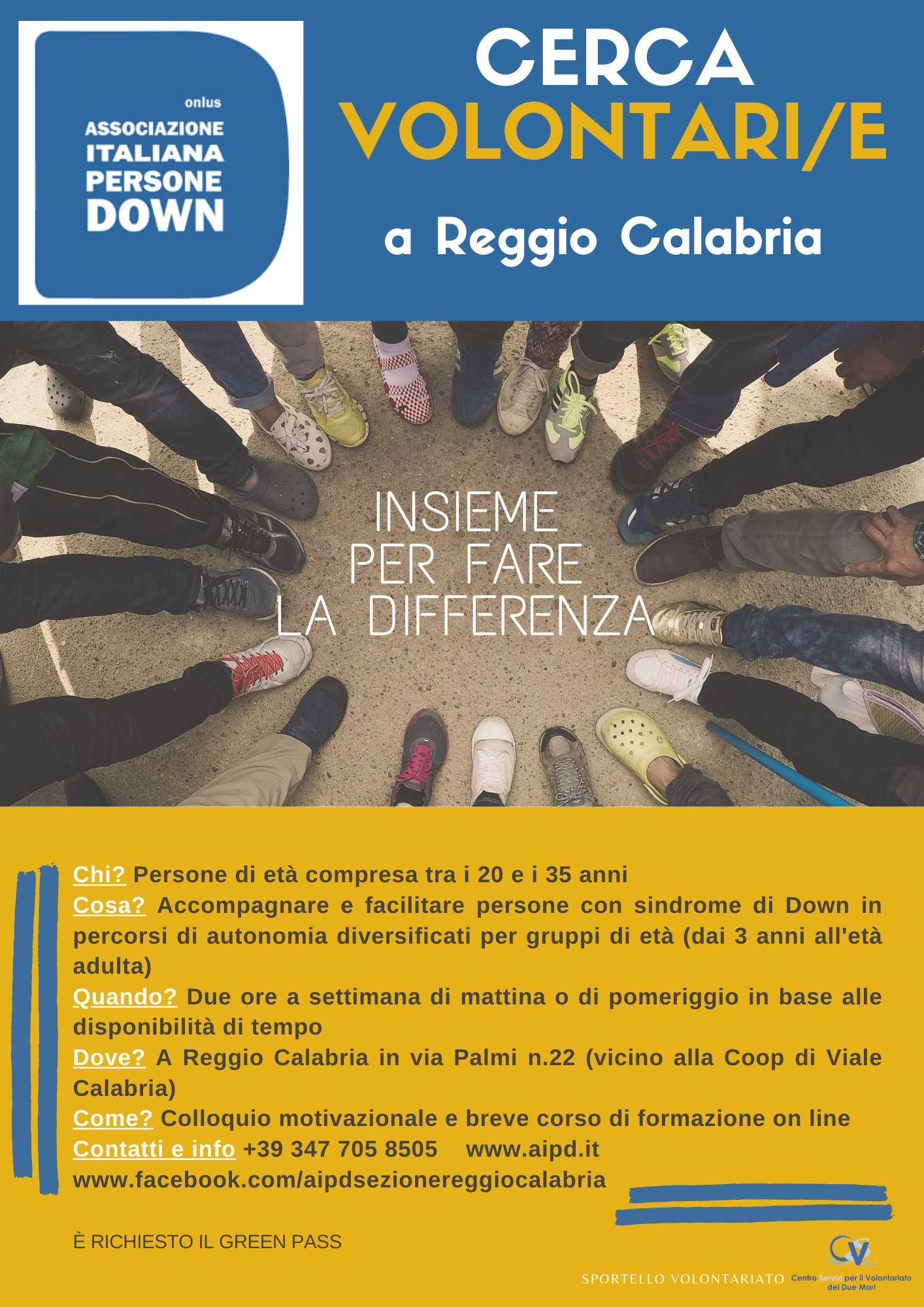 L’attività di volontariato con Aipd si svolgerà a Reggio Calabria – la cui sede si trova in via Palmi n. 22 – e consisterà nell’accompagnare e facilitare persone con sindrome di Down in percorsi di autonomia diversificati per gruppi di età (dai 3 anni all’età adulta).