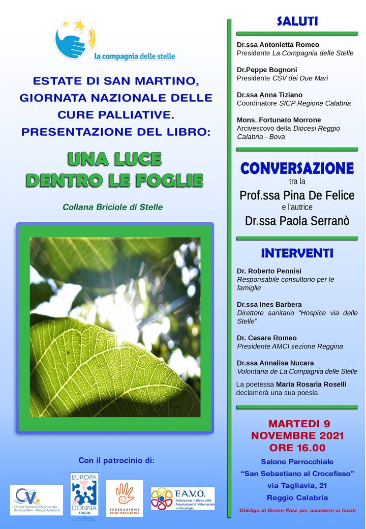 Martedì 9 novembre 2021 alle ore 16.00 presso il Salone Parrocchiale “San Sebastiano al Crocefisso”, Via Tagliavia n. 21 a Reggio Calabria, l’associazione “La Compagnia delle Stelle” promuove la presentazione del libro “Una luce dentro le foglie”.