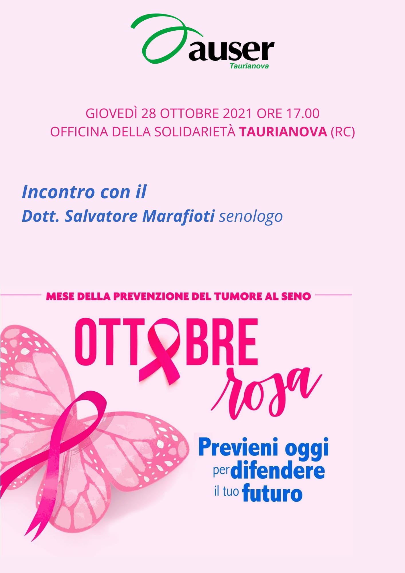In occasione del mese della prevenzione dl tumore al seno, giovedì 28 ottobre 2021 alle ore 17.00 presso l’Officina della Solidarietà a Taurianova, l’Auser Taurianova organizza un incontro con il senologo dott. Salvatore Marafioti.