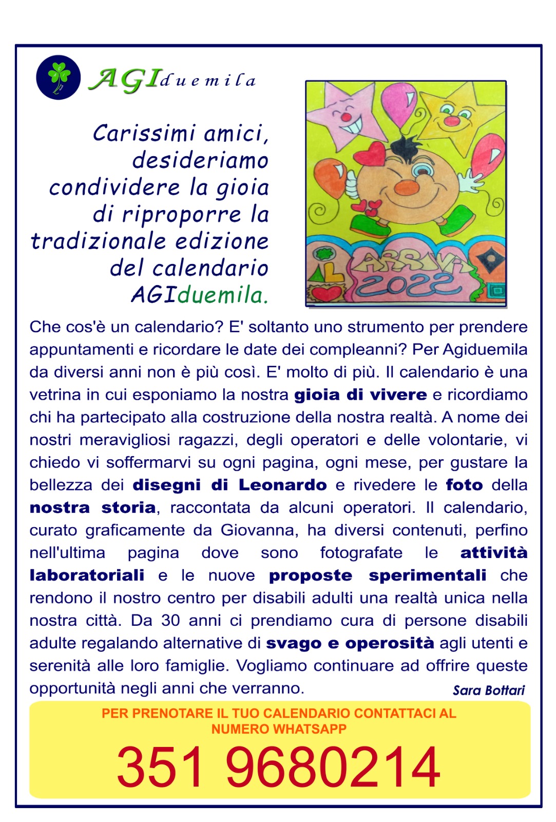 L’Associazione Agiduemila sta lavorando al prossimo calendario, che raccoglie le foto e i disegni cha rappresentano i ragazzi, gli operatori e i volontari. Si tratta di una conferma dell’attenzione dell’associazione alla maturazione dei loro ragazzi. Per esempio, Leonardo che frequenta da più di 15 anni il centro ha disegnato e colorato le raffigurazioni dei mesi. In più le foto che raffigurano le attività vecchie e nuove arricchiscono e danno significato al calendario. Questa è la prima attività di autofinanziamento post COVID.