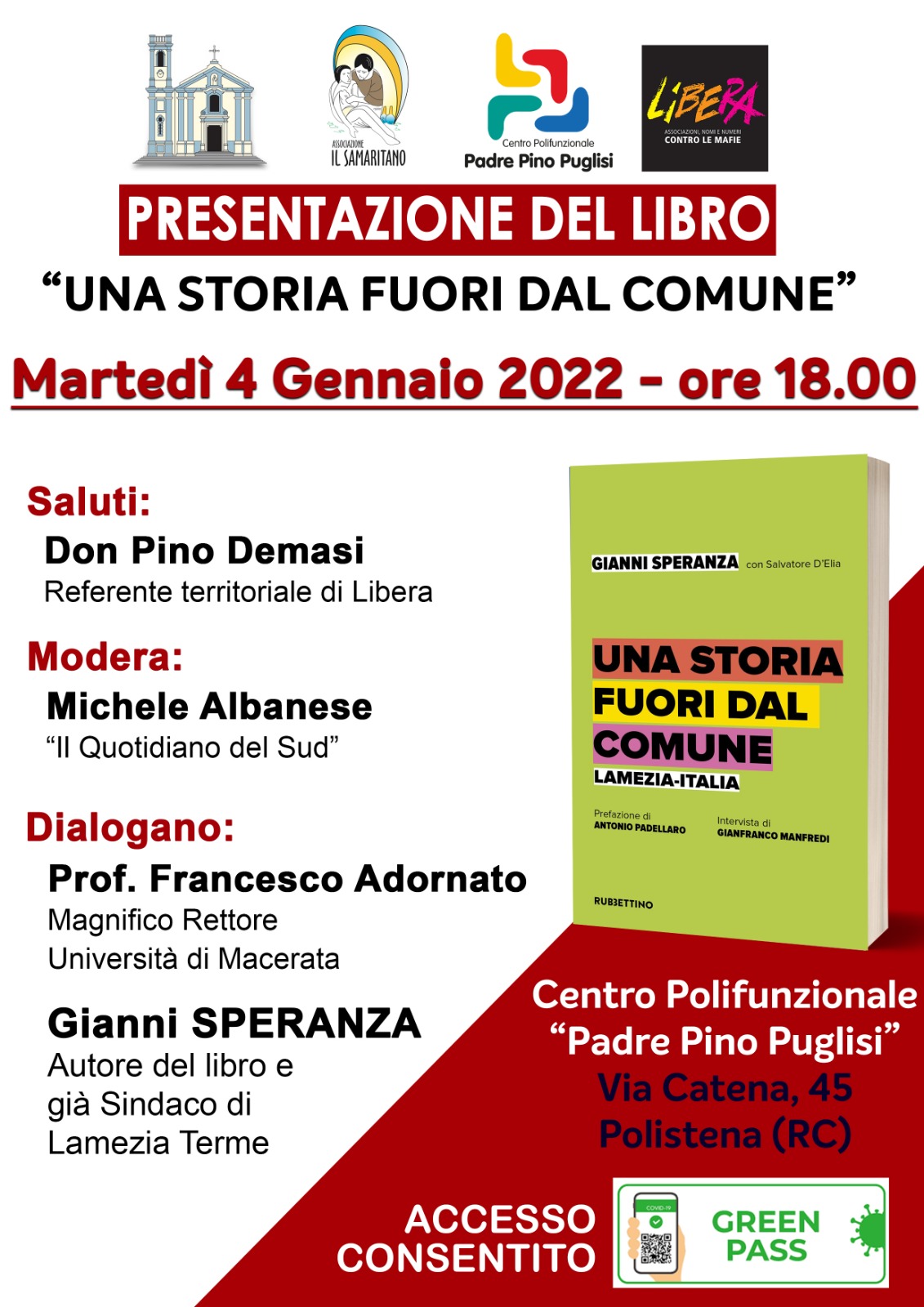 Martedì 4 gennaio 2022 alle ore 18.00 presso il Centro Polifunzionale “Padre Pino Puglisi” di Polistena, si terrà la presentazione del libro “Una storia fuori dal comune” di Gianni Speranza. L’ingresso è consentito con green pass.