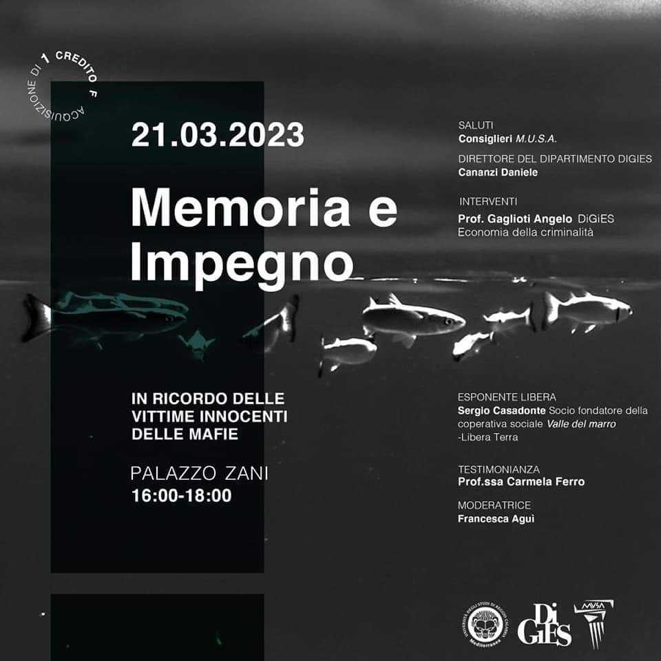 Martedì 21 marzo alle ore 16.00 presso Palazzo Zani a Reggio Calabria, si terrà un convegno in ricordo delle vittime innocenti delle mafie, organizzato dall’Università degli Studi “Mediterranea”, dal DiGiES e dall’associazione studentesca M.U.S.A.