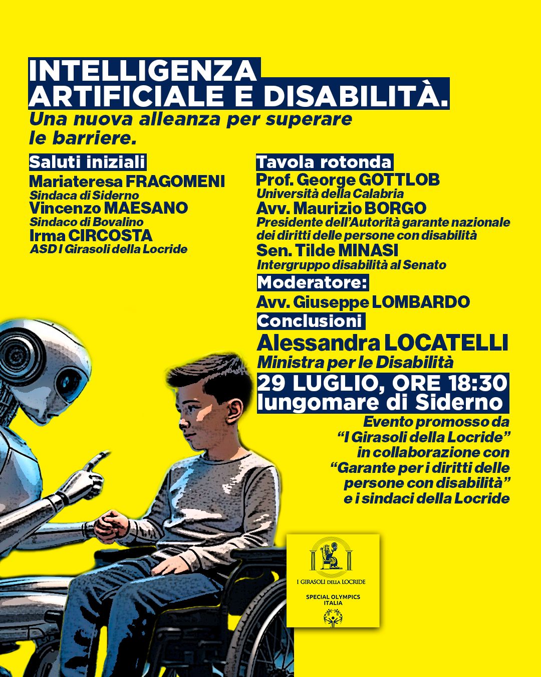 Martedì 29 luglio 2025 alle ore 18.30 sul Lungomare di Siderno l’associazione “I Girasoli della Locride”, in collaborazione con il Garante per i diritti delle persone con disabilità e i sindaci della Locride, promuovono l’evento dal titolo “Intelligenza artificiale e disabilità. Una nuova alleanza per superare le barriere”