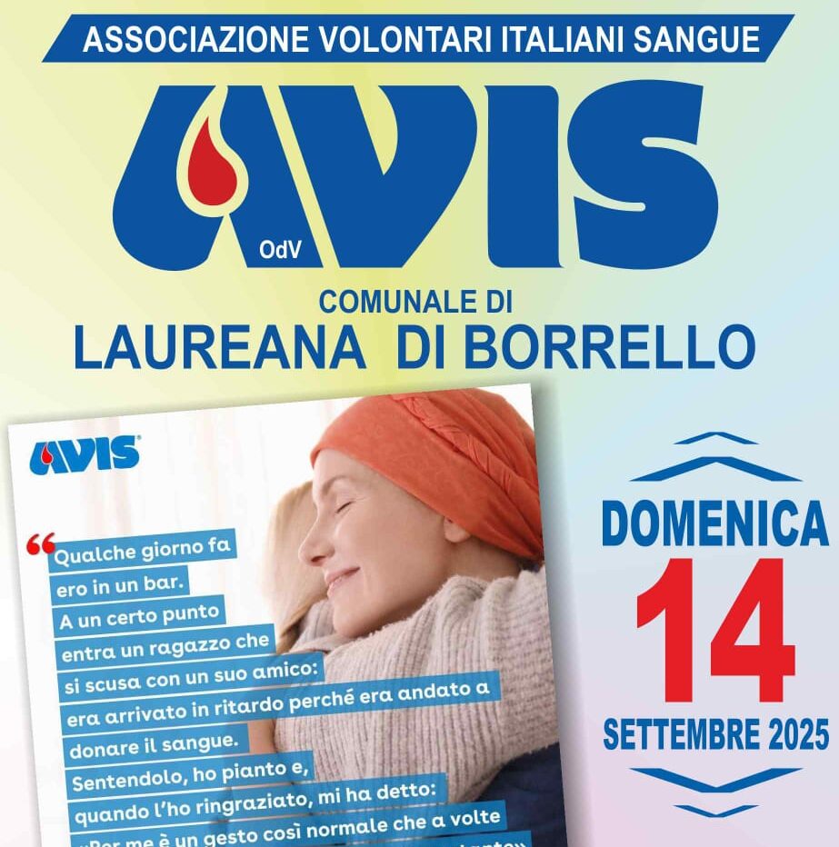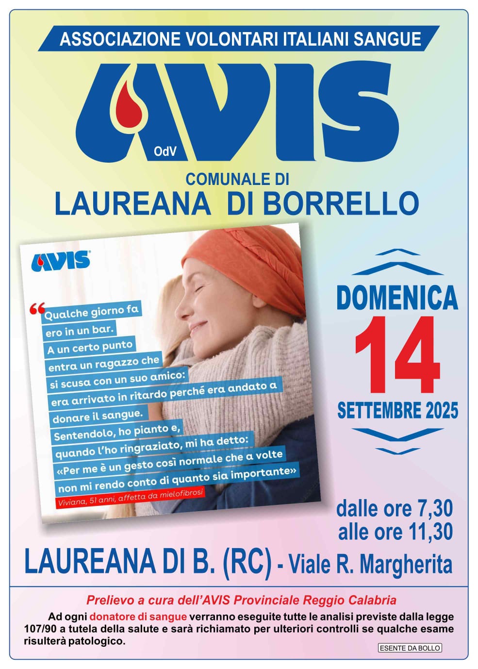 Domenica 14 settembre dalle ore 7.30 alle ore 11.30, l’AVIS Comunale di Laureana di Borrello effettuerà una raccolta del sangue presso la propria sede.