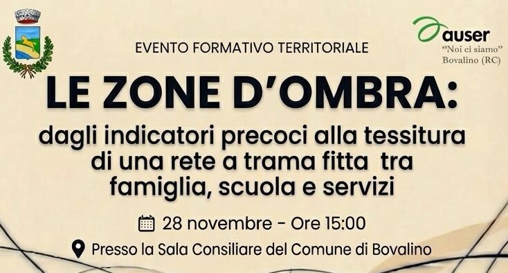 L’associazione Auser Noi ci siamo di Bovalino organizza un evento formativo dal titolo “Le zone d’ombra: dagli indicatori precoci alla tessitura di una rete a trama fitta tra famiglia, scuola e servizi”, che avrà luogo venerdì 28 novembre alle ore 15.00 presso la Sala Consiliare del Comune di Bovalino.
