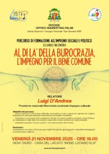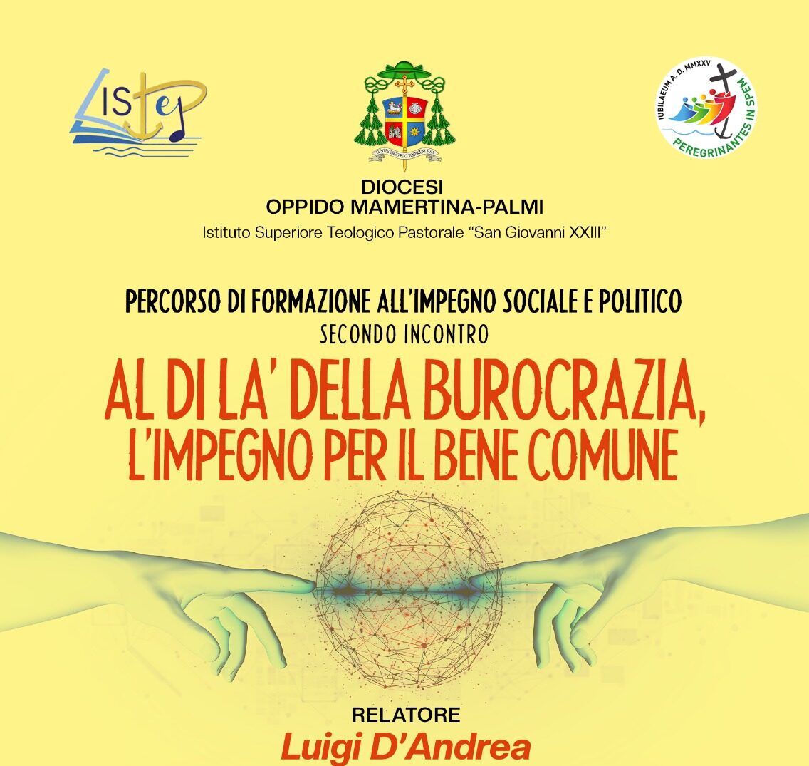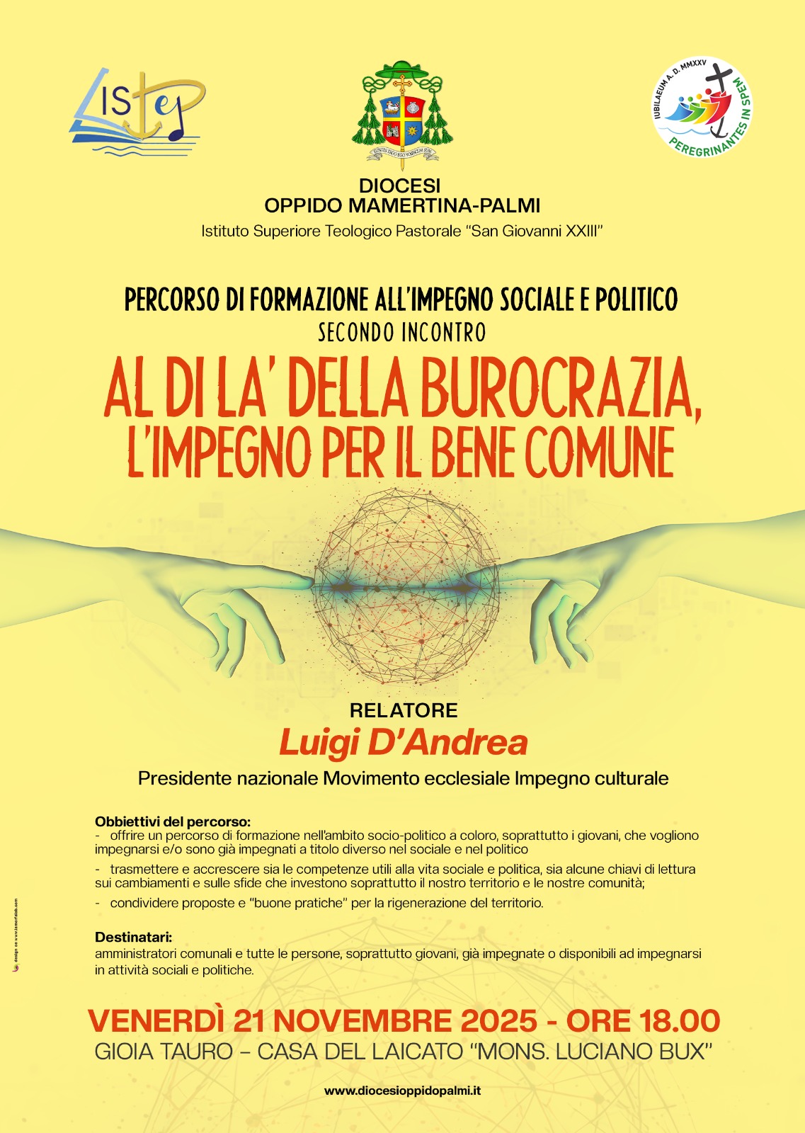 La Diocesi di Oppido Mamertina – Palmi ha avviato un Percorso di Formazione all’impegno sociale e politico. Venerdì 21 Novembre 2025 alle ore 18.00 si terrà il secondo incontro a Gioia Tauro  presso la  Casa del laicato “Mons. Luciano Bux” che avrà come tema: “Al di là della burocrazia, l’impegno per il bene comune”. Relatore dell’incontro sarà Luigi D’Andrea, Presidente nazionale Movimento ecclesiale Impegno culturale.