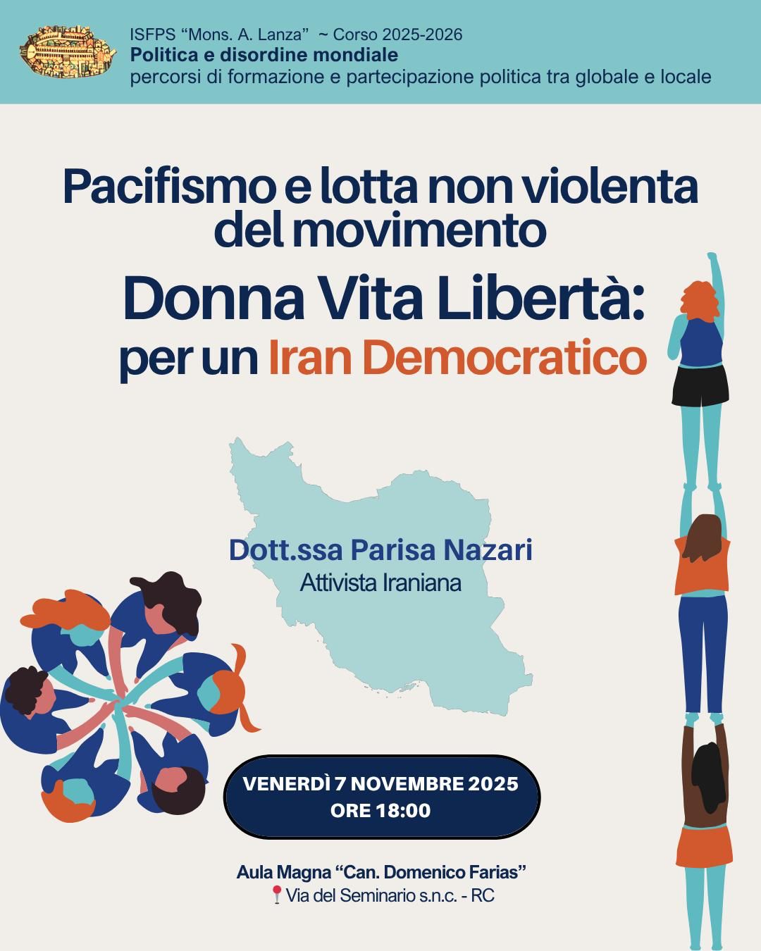 Venerdì 7 novembre 2025 alle ore 18.00 presso l’Aula Magna “Can. Domenico Farias” a Reggio Calabria, l’ISFPS Mons. A. Lanza promuove l’incontro “Pacifismo e lotta non violenta del Movimento Donna Vita Libertà: per un Iran Democratico” con la Dott.ssa Parisa Nazari, attivista dei diritti umani.