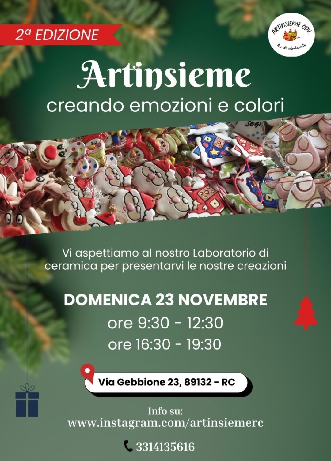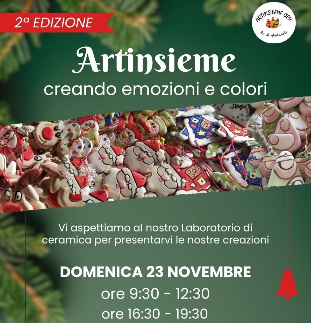L’associazione di volontariato Artinsieme ODV ha il piacere di invitare la cittadinanza a visitare il proprio laboratorio di ceramica nella giornata di domenica 23 Novembre, dalle 9:30 alle 12:30 e dalle 16:30 alle 19:30, in via Gebbione 23 a Reggio Calabria.