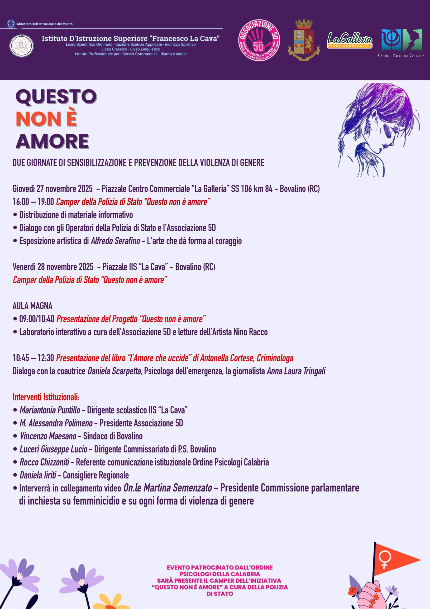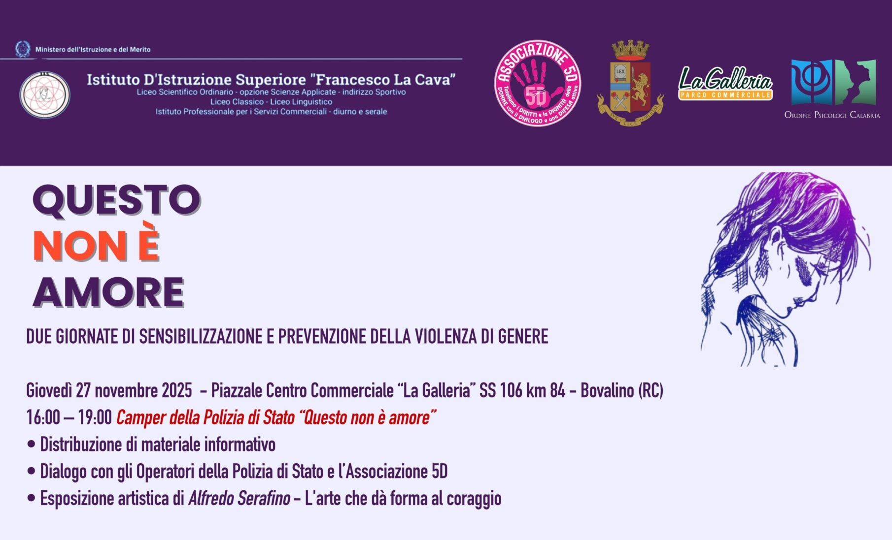 A Bovalino si accendono i riflettori sulla prevenzione della violenza di genere con l’iniziativa “Questo non è amore”, una due giorni fortemente voluta dall’Associazione 5D in collaborazione con la Polizia di Stato e l’IIS “F. La Cava”, e con il patrocinio dell’ Ordine degli Psicologi della Calabria.