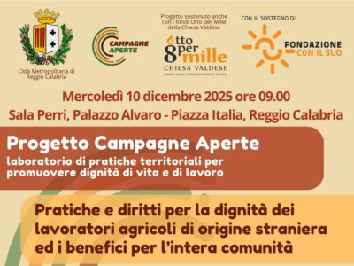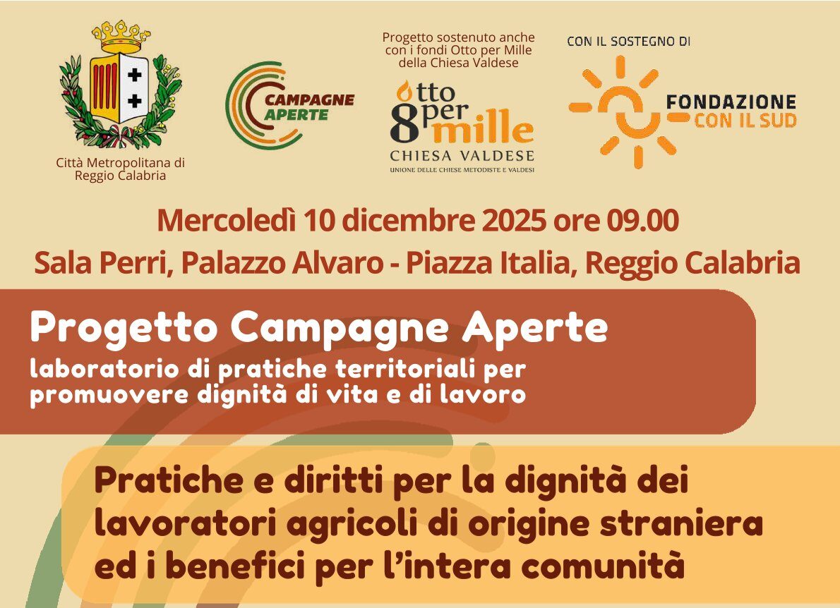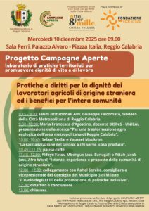Mercoledì 10 dicembre 2025 dalle 9.00 alle 13.00, presso la Sala Perri di Palazzo Alvaro a Reggio Calabria, avrà luogo il secondo incontro provinciale del progetto Campagne aperte: laboratorio di pratiche territoriali per promuovere dignità di vita e di lavoro, organizzato dal CRIC Centro Regionale d’Intervento per la Cooperazione ETS.