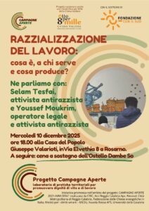 Nel pomeriggio alle ore 18.00 presso la Casa del Popolo G. Valarioti a Rosarno, si svolgerà l’incontro “Razzializzazione del lavoro: cosa è, a chi serve e cosa produce”. A seguire una cena a sostegno dell’Ostello Dambe So.