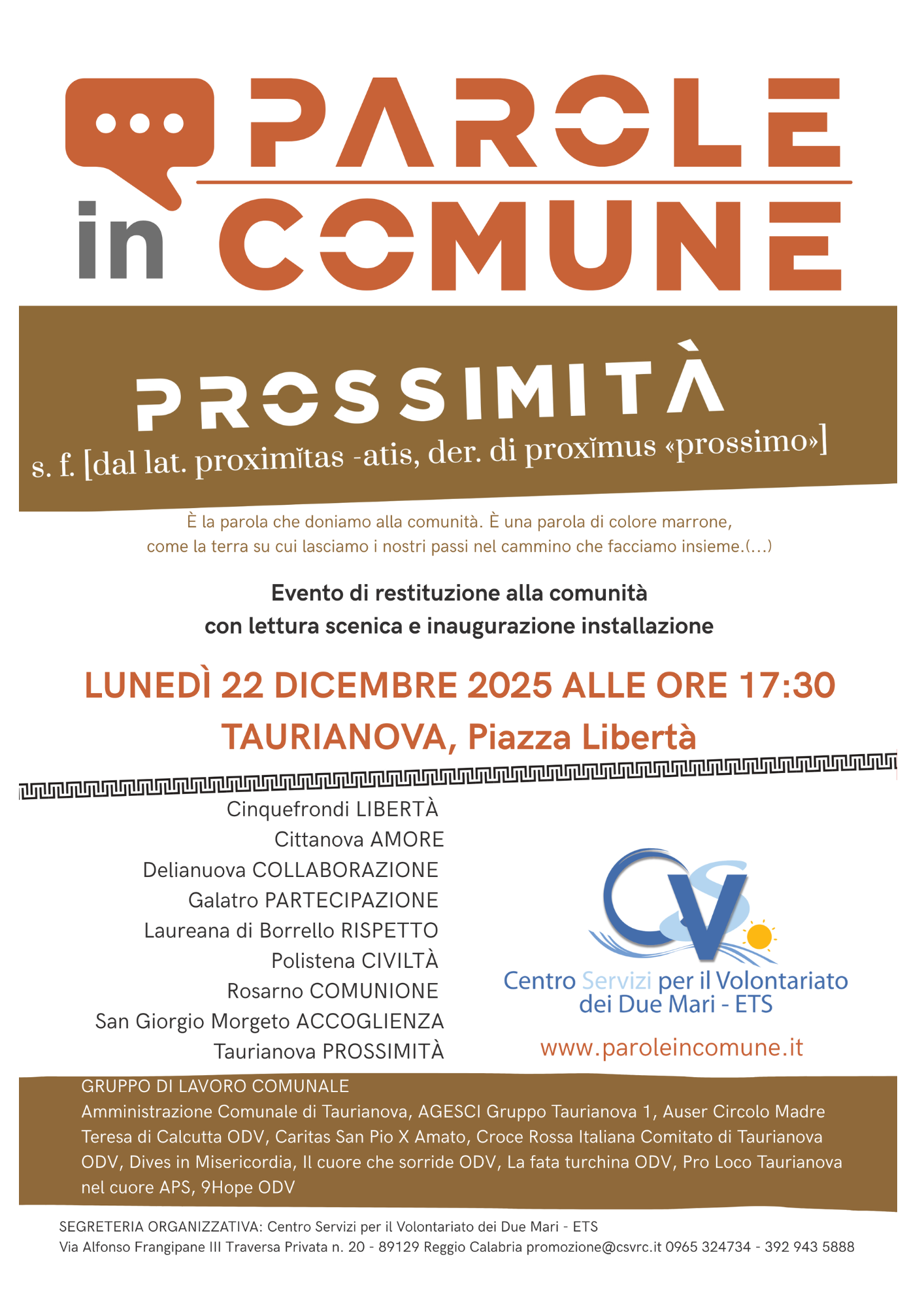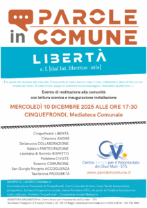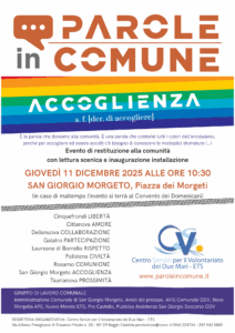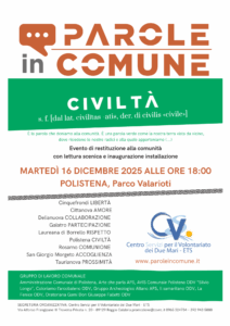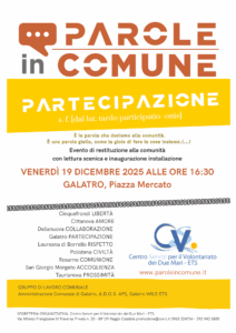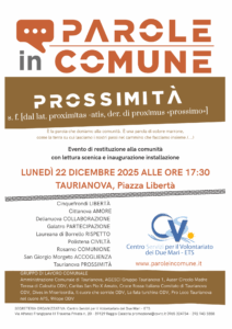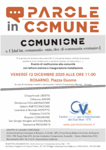 Dal 10 dicembre a metà gennaio nove Comuni della Piana ospiteranno altrettanti eventi di restituzione del percorso Parole in comune, un’attività di animazione territoriale e di promozione del volontariato coordinata dal Centro Servizi per il Volontariato di Reggio Calabria, che ha messo al centro la ricerca e l’esplorazione di parole condivise e considerate fondanti per la comunità.