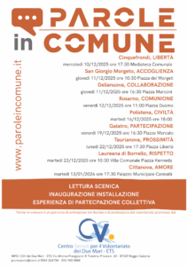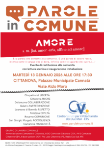 Martedì 13 gennaio alle 17:30, presso il Palazzo Municipale Cannatà in Viale Aldo Moro, sarà dedicato alla parola AMORE l’ultimo degli eventi di restituzione alla comunità del percorso “Parole in comune”, un’attività di animazione territoriale e di promozione del volontariato coordinata dal Centro Servizi per il Volontariato di Reggio Calabria, che ha messo al centro la ricerca e l’esplorazione di parole condivise e considerate fondanti per la comunità.