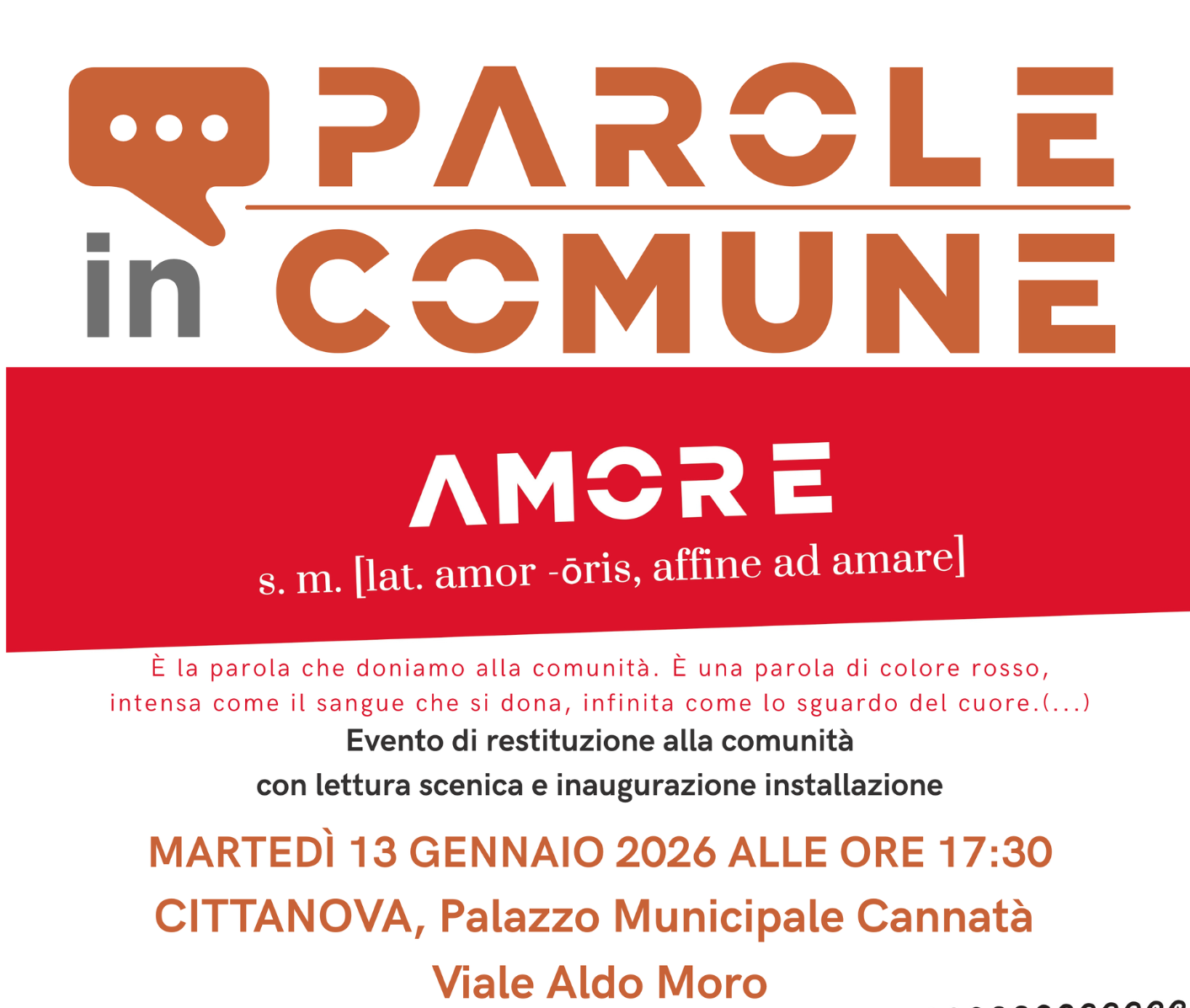 A Cittanova la parola AMORE sarà celebrata con una lettura scenica a cura del gruppo di lavoro dedicato, la posa in opera di una apposita installazione e un’esperienza collettiva, simbolica e leggera, nella quale saranno coinvolti i presenti. La partecipazione all’evento è libera e la cittadinanza tutta è invitata a partecipare.