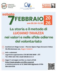 In queste iniziative rientra anche il convegno “La storia e il metodo di Luciano Tavazza nei valori e nelle sfide odierne del volontariato” che si svolgerò sabato 7 febbraio dalle ore 9.30 alle ore 13.30, presso l’Auditorium Diego Suraci della Piccola Opera Papa Giovanni Onlus.